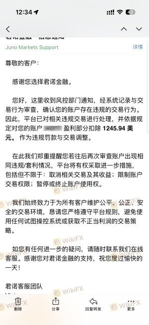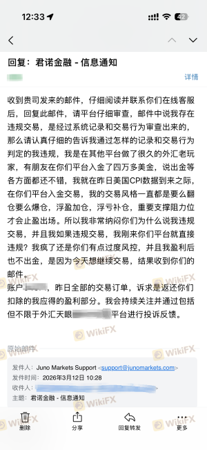 恶意扣除利润不给出金,玩不起,不让新用户盈利。在本周三cpi数据到来之际,在该平台入金1000,并且通过不断加仓的方式最终盈利1245美金,结果在次日就收到了平台发来的邮件,说我违规交易,扣除盈利,联系平台客服,要求说明违规在哪,如何判定的违规,一问三不知,只会系统性回复固定话术,我按要求回复了邮件,平台一直不予回复。典型的对赌盘,新用户必须亏损才能继续,开始就盈利必扣利润。请求天眼平台介入,诉求返还扣除我的应得利润。平台发的邮件以及我的回复邮件截图如下