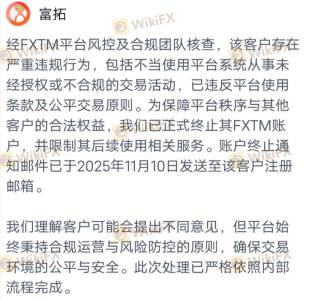 Legitimate and strictly regulated financial institutions typically have strict procedures when dealing with customer funds, especially when it comes to punitive measures such as fines and confiscation. Clear evidence of violations, prior notice to clients, opportunities for clients to appeal and defend themselves, and ultimately arbitration by independent third parties (such as regulatory agencies or arbitration institutions). It is highly abnormal to impose penalties solely based on internal professional team audits, lacking transparency and fairness. Confiscation "is a mandatory legal or administrative enforcement action, usually made by a court or specific regulatory agency in accordance with the law. A commercial company usually does not have the authority to" confiscate "citizens' legal property. A responsible platform should have a clear regulatory framework and appeal channels for all operations, especially those involving punishing customers. If the platform cannot provide clear terms and procedures recognized by regulatory authorities on which its actions are based, then the legality of its actions is seriously questionable. A regulated platform must have laws and regulations to follow in its behavior, rather than relying on some bullshit professional review by an internal professional team. FXTM is an extremely hypocritical and hypocritical platform, with a high score of 9.26, doing things that seriously lack supervision. It did not negotiate with customers in advance, did not display clear evidence of violations, did not give customers the opportunity to defend themselves, did not have third-party arbitration, and did not have a judgment. However, based on just one email, if you violate the rules, you can confiscate the customer's account amount and then close the account