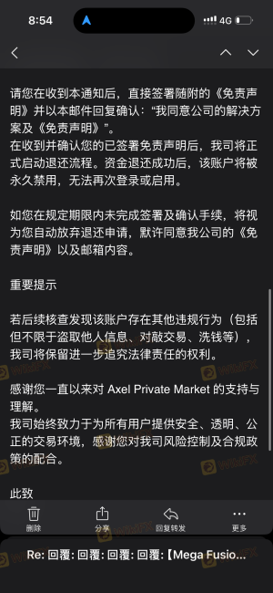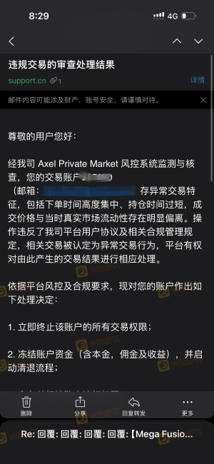 这几天黄金行情很好我在Axel正常交易盈利了1-2万美金,结果今天突然不给出金,发了一封莫名其妙的邮件,就说我违规交易,现在MT4平台,和网页均登陆不上,联系线上客服也不给处理,发邮件也不给回复,哎都怪我不小心选择了黑平台,望各位投资者引以为戒,哎!Axel你太辜负投资者的信任了
