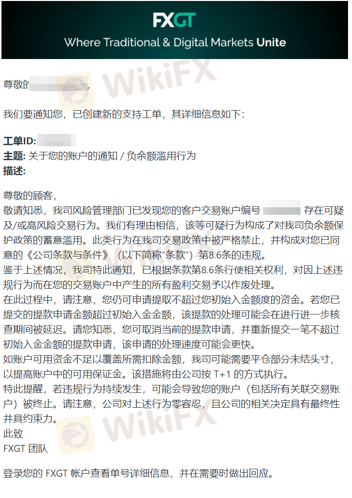 I am an FXGT user and hereby lodge a complaint against your platform for arbitrarily deleting my account and deducting funds without prior notice or reasonable explanation, severely infringing upon my lawful rights and interests. I. Incident Details I registered as a user on your platform and completed identity verification and facial recognition in accordance with platform rules. During my usage, I consistently adhered to the platform's user agreement and engaged in no violations. • On September 3, 2025, I discovered I could not log into my account. Upon accessing the backend, I found the account had been deleted without any prior notification. • I submitted a support ticket demanding evidence and the return of my funds. However, the platform repeatedly refused, citing vague reasons such as “automated risk control” and “violation of platform rules,” without providing any specific evidence of wrongdoing. II. Grounds for Complaint 1. Unjustified Account Deletion: The platform unilaterally deleted my account without prior notice or clear evidence of violations, breaching our contractual agreement and principles of fairness. 2. Withholding Funds Violates Property Rights: Funds in the account constitute my lawful personal property. The platform has no authority to arbitrarily deduct or refuse to return these funds. 3. Customer service evasion and lack of resolution intent: Repeated communications yielded no substantive response. The platform evades responsibility, severely damaging user experience and trust. III. Demands 1. Immediately restore my account or provide explicit evidence of violations and legal basis for account deletion. 2. Unconditionally return the funds deducted from my account. 3. Issue a formal apology for this incident and improve platform rules and customer service procedures to prevent recurrence. IV. Follow-Up Actions Should your platform persist in disregarding user rights and refusing to resolve this matter, I will take the following measures to protect my interests: • File complaints with market regulatory authorities, financial regulators, and other relevant bodies; • Publicize this incident through media outlets and social platforms. I urge your platform to take this matter seriously.