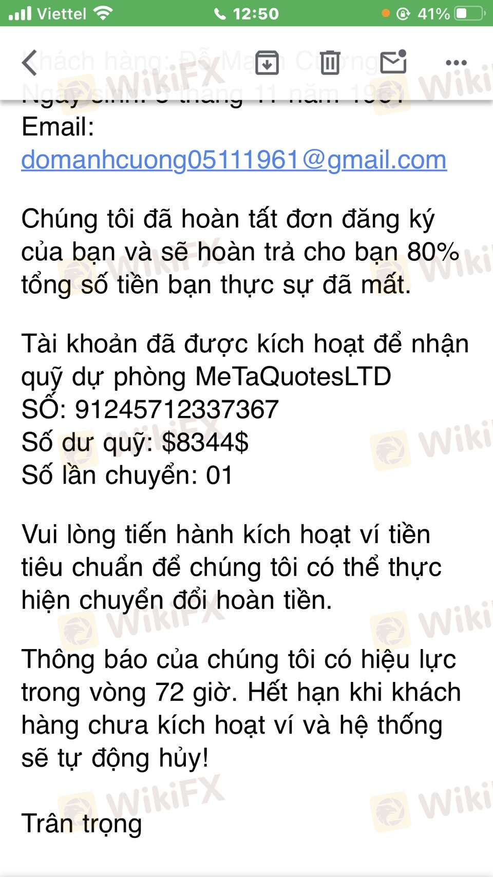 I traded at Gallen Capital with ID 5516697. During the trading process, I deposited a total of 11 thousand dollars. After a period of trading, when I tried to withdraw funds, I couldn't. When I asked the platform, they said it was because my trading volume was not sufficient. I continued trading for a while but still couldn't withdraw funds, with the reason being insufficient trading volume. Then, the platform instructed me to trade the recommended code "wheat.g" and I traded 0.5 lots of that code, resulting in a complete loss of my account. I want to report this platform as a scam that embezzles customers' money. The mastermind behind this is a person named Khanh, who is the fund manager of the platform. They recommended the Wheat.g code for customers to trade and manipulated the price to burn customers' accounts. Their phone number is: 076-2258504. After I posted the accusation on Wikifx, I received a reply from the MetaQuotestLTD reserve fund, but I still haven't received the money back. I have attached the images below. Everyone, please do not trade on this platform!