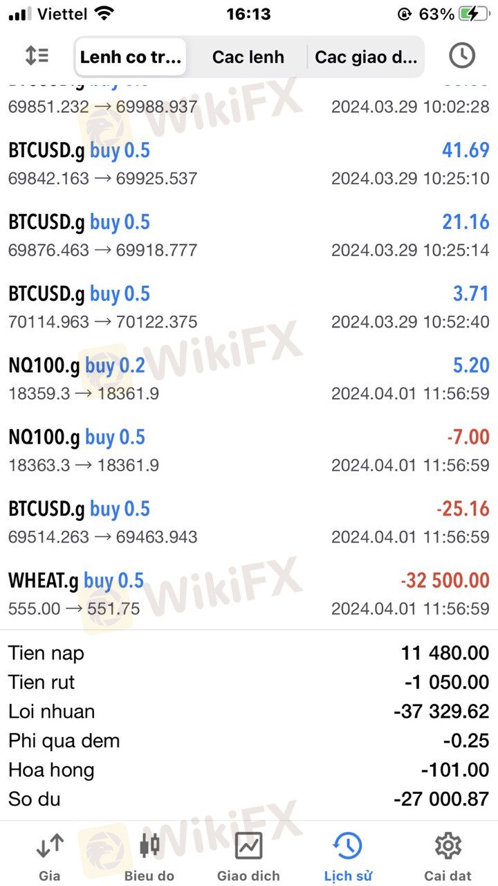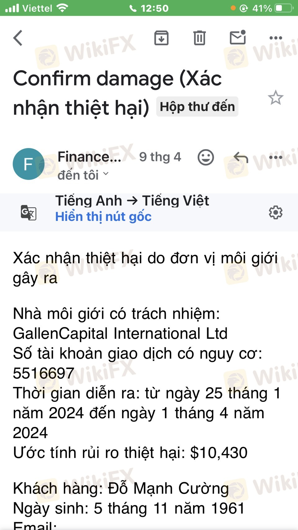On January 16, 2024, I was introduced to Gallen Capital by a freelance consultant. I saw the name of the Swiss exchange so I felt secure in joining. First, I invested $100 to try to see if I could deposit and withdraw quickly. No, then when I tried to withdraw $50, everything happened quickly and normally, although the deposit and withdrawal fee was very high compared to other exchanges, when I deposited 24,500, I received $100, but when I withdrew $1,000, I only received back 23,700. , which means the deposit and withdrawal fee is 800,000 VND/1000 USD, the floor explained that the bank they collect is (MSB Bank) and the recipient is Global Trading Company. Next, I entered 2000 USD to continue trading. After I entered 2000 USD, someone named Khanh (Phone number 076-2258504) contacted me and said he was in charge of the floor's fund and invited me to join the 15,000 package. USD to receive the floor's incentives, Khanh called me a lot to tell me to join the 15,000 package, saying that this package has been available for a long time and that many people want to receive this package. If you don't join right away, you will lose your opportunity. Well, then I talked to Thien again, and Thien said he would join me for about 6,000 dollars. After that, I transferred 193 million to the exchange's account and told Thien to add the remaining amount. Thien's reason was that he could not get the money. I reported to the floor and the floor forced me to deposit the full amount of 15,000. I said I didn't have enough money to put in anymore. The floor refused and forced me to make enough margin to approve the withdrawal, then the floor blocked it. My withdrawal order, next, Khanh transferred my file to David Tran for further processing. David Tran told me to place a very large order with the purpose of letting me quickly burn out my account, after that I did not. trading again, when I went to register to withdraw money, the portal to the exchange's website was locked to withdraw money. After that, I called Khanh back and he kept asking me to make enough margin to approve the withdrawal order. Next, a guy made friends and sent a message saying that a person from the exchange named Cuong Pham would help me. Better trading, I traded according to the code it suggested which was Wheat(CME). As soon as I entered 0.5 lots, my account was negative 32,500 USD and my account burned out. I have attached pictures here for everyone to see. This is a scam floor, if anyone is still trading or planning to invest in this floor, they must stop immediately. I am very angry because I was tricked by them into investing money here. I am writing this article to hope that the online community and the authorities will immediately arrest these Gallen Capital brokers.