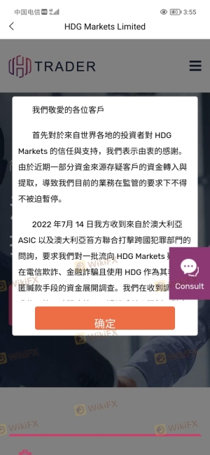 Our dear customers: First of all, we would like to express our heartfelt thanks to investors from all over the world for their trust and support to HDG Markets. Due to the recent transfer and withdrawal of funds from some customers with doubtful sources of funds, our current business had to be suspended due to regulatory requirements. On July 14, 2022, we received an inquiry from the Australian ASIC and the Australian Anti-Transnational Crime Department, asking us to investigate a batch of suspected wire fraud, financial fraud and use HDG as its illegally concealed illicit money flowing to HDG Markets. Means of funding to launch an investigation. After we received the investigation request, we immediately froze suspicious accounts and restricted the use, deposits and withdrawals of corresponding accounts. Unfortunately, during the two-week appeal period, we were unable to receive strong supporting materials during our communication with the account holders, which led to further escalation of our investigation by the regulatory authorities, which has now been frozen. Our margin clearing account at National Australia Bank (NAB) and all our liquidity clearing accounts. In view of the requirements of the regulators and the Australian police, from now on, all new accounts, derivatives contract trading services and customer deposits and withdrawals of HDG Markets will be suspended until we cooperate with the police to complete all evidence transfer and operate normally. During this period, I hope that investors will remain patient, and we will continue to further investigate the accounts involved in this incident and ask them to add more evidence so that we can complete the review as soon as possible. We are very sorry for the inconvenience caused to you during this period, and thank you for your active understanding and patience. HDG Markets August 8, 2022 Confirmed