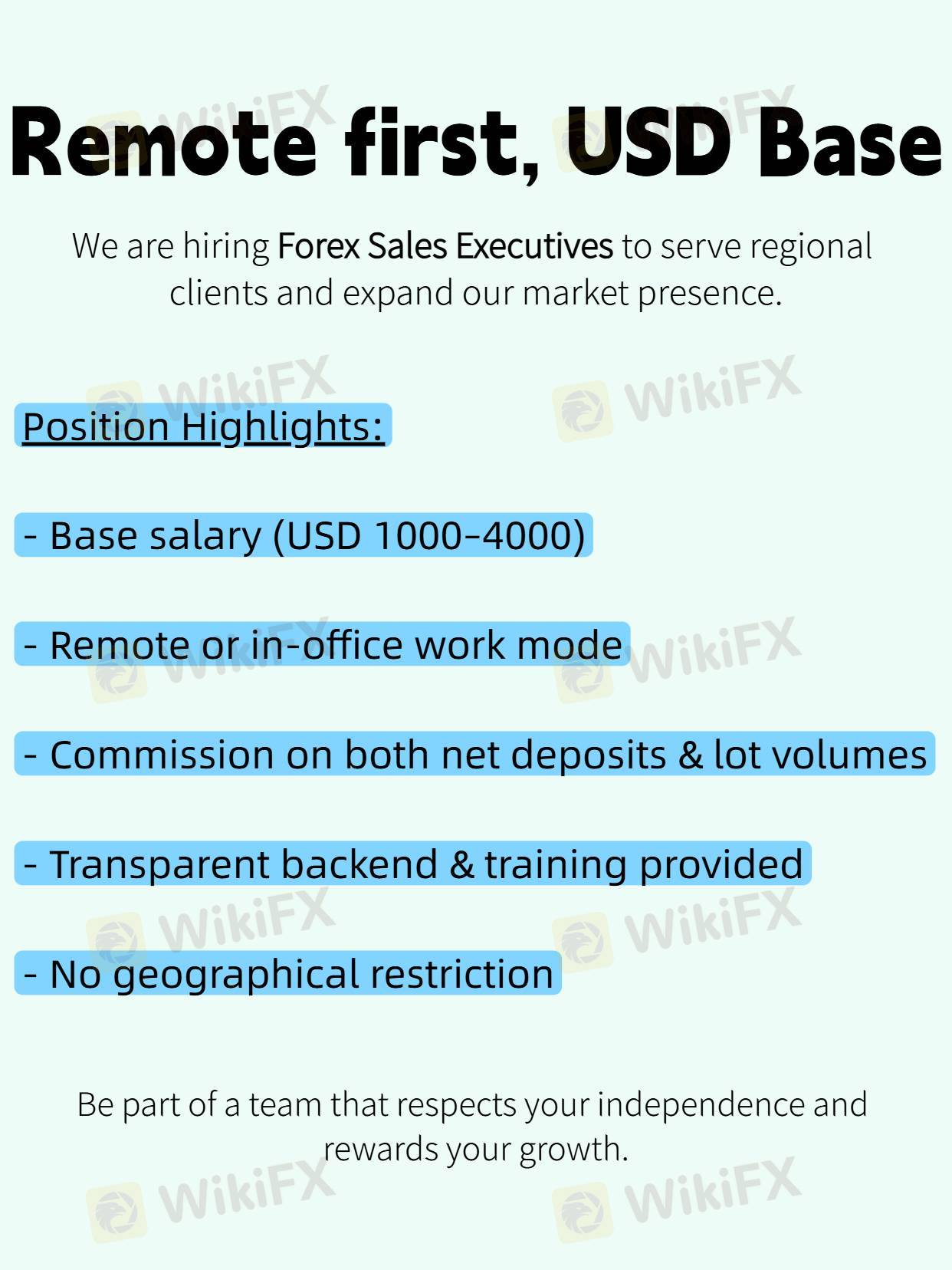 We are hiring Forex Sales Executives to serve regional clients and expand our market presence. Position Highlights: - Base salary (USD 1000–4000) - Remote work mode - Commission on both net deposits & lot volumes - Transparent backend & training provided - No geographical restriction Be part of a team that respects your independence and rewards your growth.