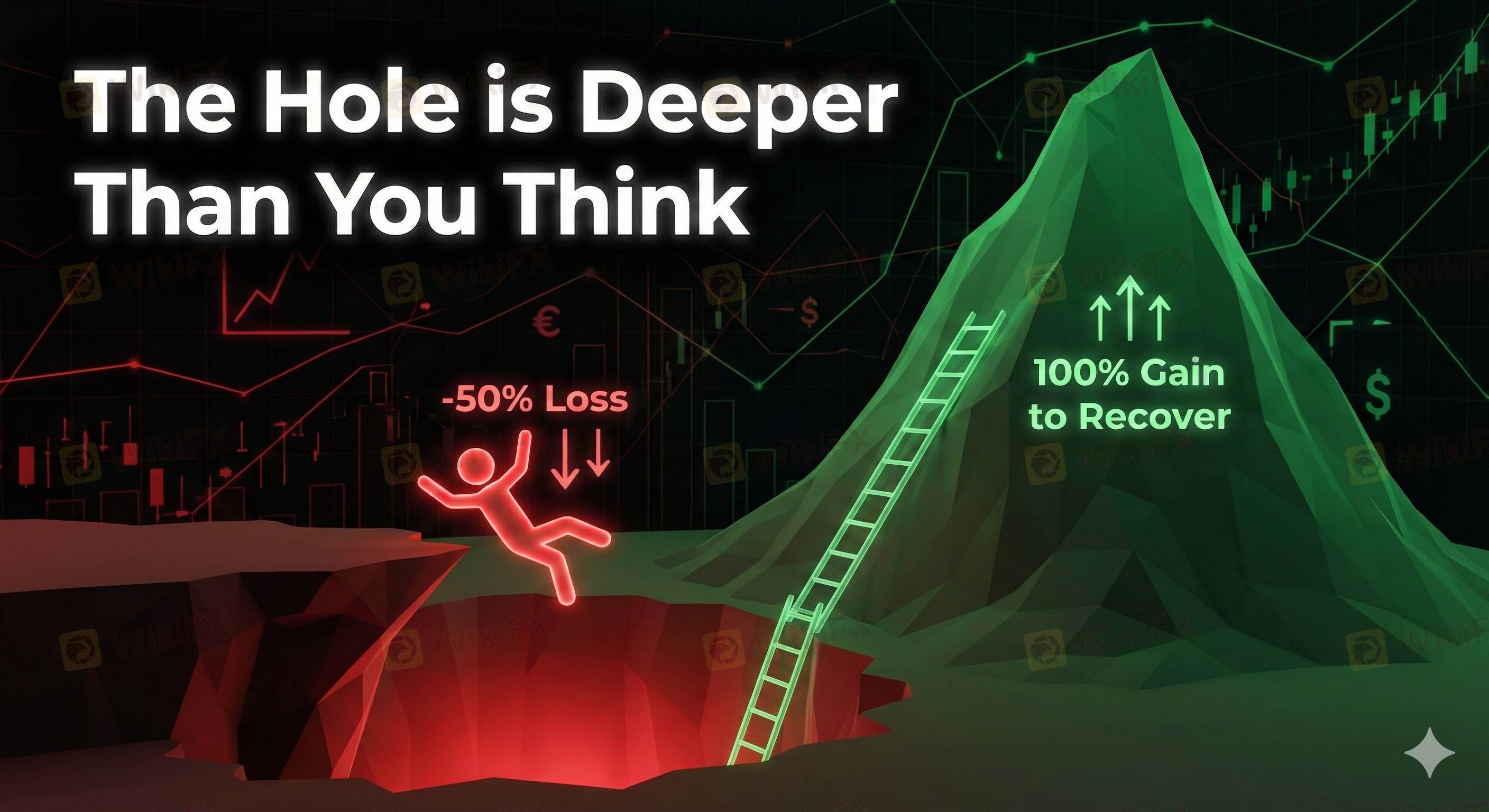 The SetupYou took a hit. A big one.Maybe you held a losing trade too long, hoping it would bounce back. Maybe you "averaged down" into a falling knife. Maybe you just got unlucky on an earnings call.You look at your portfolio. You are down 50%.Your amateur brain kicks into "Survival Mode." It whispers a comforting lie to you:"It’s okay. We just need to make 50% back to get even. We can do that. We’ll just trade a little larger, a little faster."The LieLook at the image above. Really look at it.That stick figure falling off the cliff? That’s you.That massive mountain next to him? That is the climb you now face.Here is the brutal truth that the market hides from you: Market math is not linear. It is geometric.If you lose 50% of your money, a 50% gain does not get you back to breakeven.If you have $10,000 and lose 50%, you have $5,000 left.To turn that $5,000 back into $10,000, you need to gain $5,000.That is a 100% return on equity.You dug a 50-foot hole, but the ladder out is 100 feet tall.The Table of DoomMost traders ignore risk management because they think they can "trade their way out" of a drawdown. They don't realize that as losses compound, the recovery effort required goes parabolic.Lose 10% $\rightarrow$ Need 11% Gain (Manageable)Lose 20% $\rightarrow$ Need 25% Gain (Hard)Lose 30% $\rightarrow$ Need 43% Gain (Very Hard)Lose 40% $\rightarrow$ Need 67% Gain (Pro Level Only)Lose 50% $\rightarrow$ Need 100% Gain (The Death Zone)Lose 90% $\rightarrow$ Need 900% Gain (Impossible)Once you cross the 25% drawdown line, the math begins to suffocate you. The gravity of the market pulls harder the deeper you fall.The Psychological Trap (The Revenge Trade)This is where the "Death Spiral" truly begins.When a trader realizes they need a 100% return just to survive, they panic. They realize that trading with their normal, safe position size will take years to recover the loss.They don't have years. Their ego demands they fix this now.So, what do they do?They increase their leverage. They take riskier setups. They ignore their stop losses. They try to hit a home run to clear the debt in one swing.In the image, this is the equivalent of the stick figure trying to jump up the mountain in a single leap.It never works. You slip. You fall. And now, you aren't down 50%. You are down 75%.(To recover from a 75% loss, by the way, you need a 300% gain).The Only Way Out: Defense FirstThe professional trader looks at the image above and feels nothing. Why?Because they never let themselves get near the cliff edge.The "Secret" of the top 1% of traders isn't that they are better at predicting the future. It’s that they are better at losing.They understand that once you fall into the pit, the game changes.The amateur focuses on how much they can make.The professional focuses on how much they can lose.If you cut every loss at 2% or 5%, you never face the mountain. You walk on flat ground. You can trip, dust yourself off, and keep walking.The LessonStop looking for the "Holy Grail" indicator that predicts entries.The Holy Grail is Position Sizing.If you are currently in a drawdown, stop digging.Accept the new reality. Your account size is what it is today, not what it was yesterday.Size down, not up. It is counter-intuitive, but to recover, you must trade smaller, not bigger. You need to rebuild confidence, not just capital.Respect the Math. Do not fight the percentages.The market is a patience game. The cliff is always there, waiting for the arrogant.Don't be the guy in the pit looking up at a mountain he built himself.Stay humble. Execute logic. Manage risk.