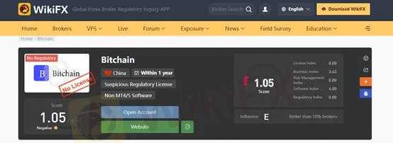When it comes to regulatory information, Bitchain does not fall under any valid regulations. That is why its regulatory status on WikiFX is listed as “No License” and it receives a relatively low score of 1.36/10. Please be aware of the risk.
