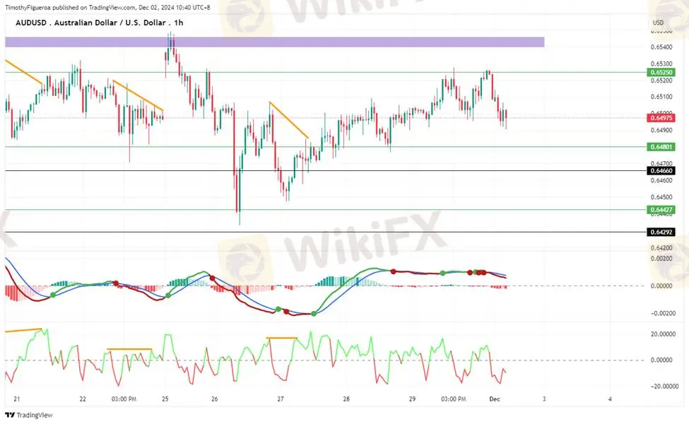 AUDUSD - The Australian dollar remains weak, with prices consolidating between 0.63407 and 0.64086. Momentum suggests continued selling, as reflected in overbought RSI levels despite minimal upward movement. The MACD turning flat reinforces the lack of conviction for upward moves. Analysts expect the bearish trend to persist.