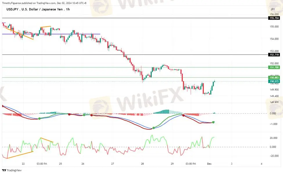 USDJPY - The yen continues to weaken as the BOJ signals a cautious approach to rate hikes. Momentum indicates a stronger likelihood for yen buying, though the MACD reflects diminishing momentum, hinting at a pullback. The RSI shows divergence in price and highlights strong buying movement despite potential corrections.