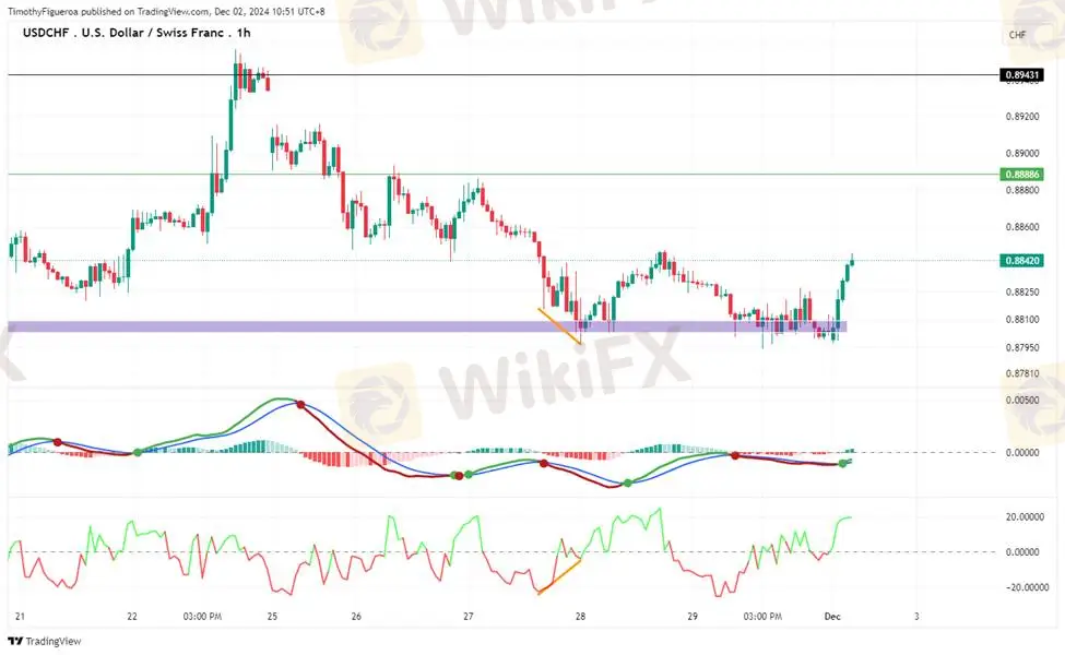 USDCHF - The franc is slowing down after reaching a previous high, signaling increasing weakness. The MACD reflects rising momentum for selling, suggesting a deeper pullback. However, the RSI indicates oversold conditions, leaving room for a potential return to buying momentum. Overall price action supports a continuation of the bullish trend following the breakout from previous consolidation.