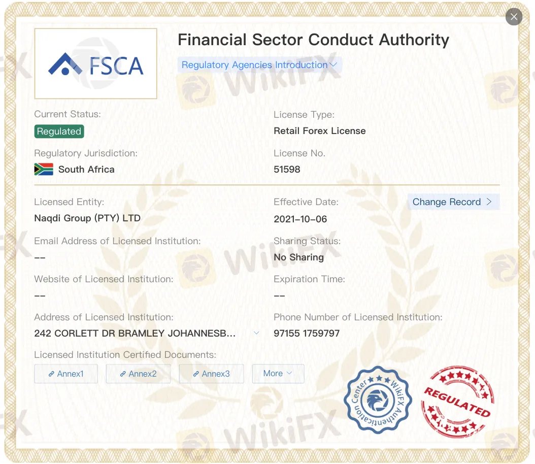 The Valid License (South Africa): Naqdi Group (PTY) LTD holds a valid Financial Service Provider license from the FSCA (South Africa) under license number 51598. This indicates that for clients specifically contracted under the South African entity, there is a layer of legal oversight.