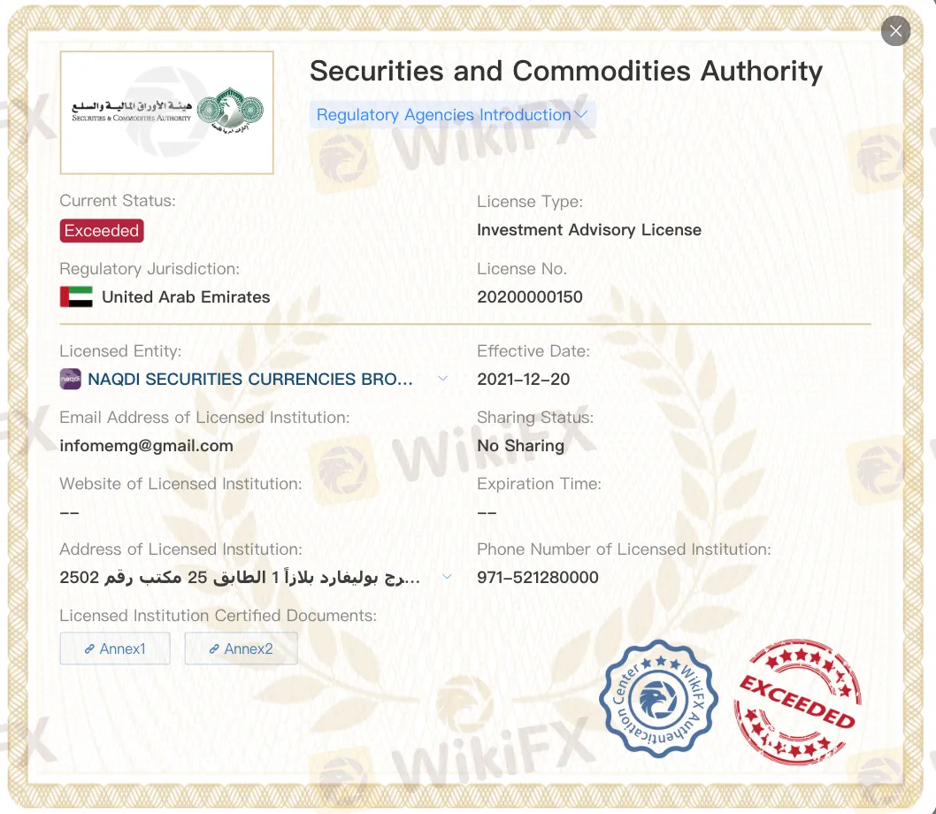 The “Exceeded” License (UAE - Critical Warning): The primary risk stems from its UAE operations. According to WikiFX data, Naqdi Securities Currencies Brokers holds a license from the UAE Securities and Commodities Authority (SCA) (License No. 20200000150).