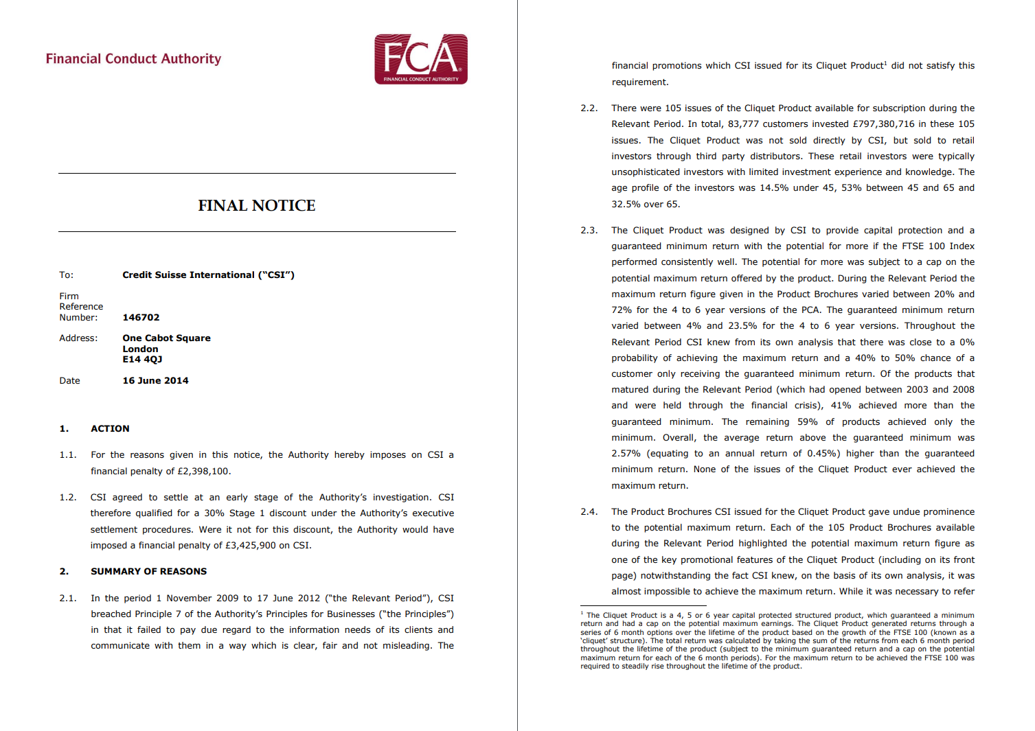 The Cliquet Product was designed by CSI to provide capital protection and a guaranteed minimum return with the apparent potential for significantly more if the FTSE 100 performed consistently well. The probability of achieving only the minimum return was 40-50% and the probability of achieving the maximum return was close to 0%. Despite this CSI’s and YBS’s financial promotions marketed the potential maximum return on the product as a key promotional feature.