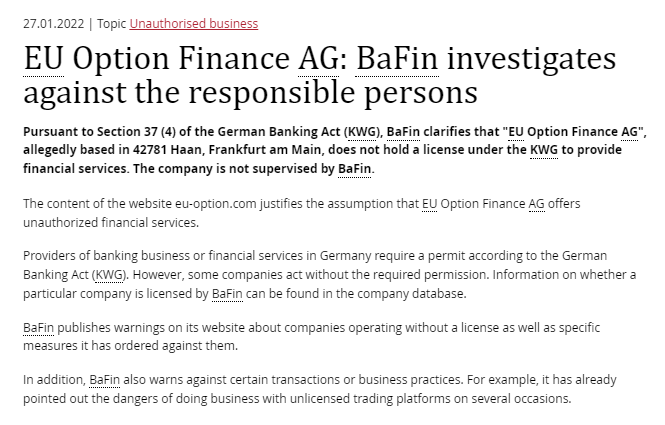 27.01.2022 | Topic Unauthorised business EU Option Finance AG: BaFin investigates against the responsible persons Pursuant to Section 37 (4) of the German Banking Act (KWG), BaFin clarifies that "EU Option Finance AG", allegedly based in 42781 Haan, Frankfurt am Main, does not hold a license under the KWG to provide financial services. The company is not supervised by BaFin. The content of the website eu-option.com justifies the assumption that EU Option Finance AG offers unauthorized financial services. Providers of banking business or financial services in Germany require a permit according to the German Banking Act (KWG). However, some companies act without the required permission. Information on whether a particular company is licensed by BaFin can be found in the company database. BaFin publishes warnings on its website about companies operating without a license as well as specific measures it has ordered against them. In addition, BaFin also warns against certain transactions or business practices. For example, it has already pointed out the dangers of doing business with unlicensed trading platforms on several occasions.