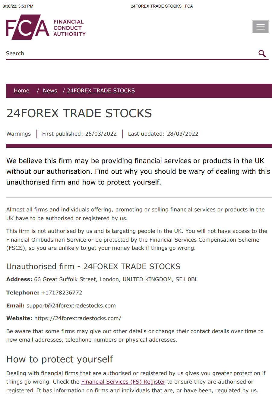 Unauthorised firm - 24FOREX TRADE STOCKS