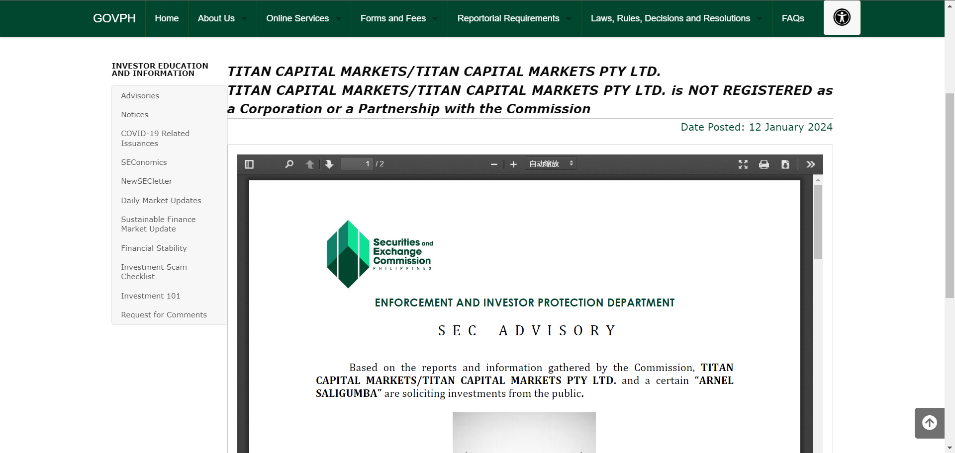 Based on the reports and information gathered by the Commission, TITAN CAPITAL MARKETS/TITAN CAPITAL MARKETS PTY LTD. and a certain “ARNEL SALIGUMBA” are soliciting investments from the public.