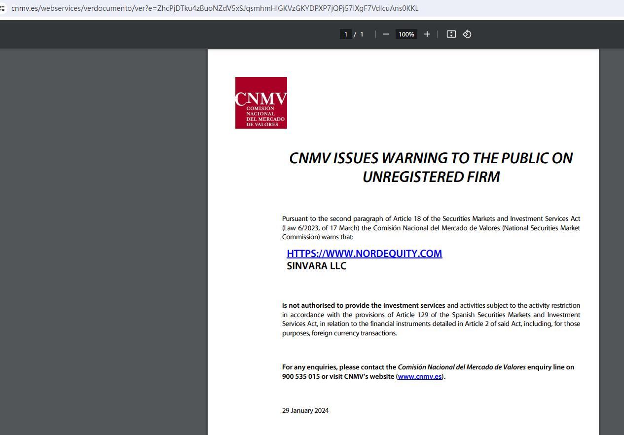 CNMV ISSUES WARNING TO THE PUBLIC ON UNREGISTERED FIRM Pursuant to the second paragraph of Article 18 of the Securities Markets and Investment Services Act (Law 6/2023, of 17 March) the Comisión Nacional del Mercado de Valores (National Securities Market Commission) warns that: HTTPS://WWW.NORDEQUITY.COM SINVARA LLC is not authorised to provide the investment services and activities subject to the activity restriction in accordance with the provisions of Article 129 of the Spanish Securities Markets and Investment Services Act, in relation to the financial instruments detailed in Article 2 of said Act, including, for those purposes, foreign currency transactions. For any enquiries, please contact the Comisión Nacional del Mercado de Valores enquiry line on 900 535 015 or visit CNMV’s website (www.cnmv.es). 29 January 2024