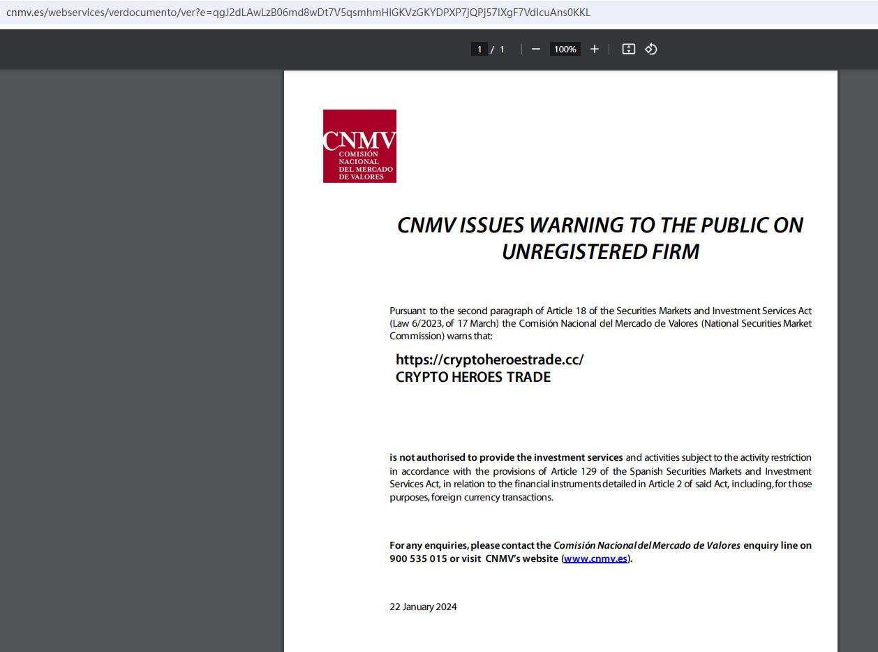 CNMV ISSUES WARNING TO THE PUBLIC ON UNREGISTERED FIRM Pursuant to the second paragraph of Article 18 of the Securities Markets and Investment Services Act (Law 6/2023, of 17 March) the Comisión Nacional del Mercado de Valores (National Securities Market Commission) warns that: https://cryptoheroestrade.cc/ CRYPTO HEROES TRADE is not authorised to provide the investment services and activities subject to the activity restriction in accordance with the provisions of Article 129 of the Spanish Securities Markets and Investment Services Act, in relation to the financial instruments detailed in Article 2 of said Act, including, for those purposes, foreign currency transactions. For any enquiries, please contact the Comisión Nacional del Mercado de Valores enquiry line on 900 535 015 or visit CNMV’s website (www.cnmv.es). 22 January 2024