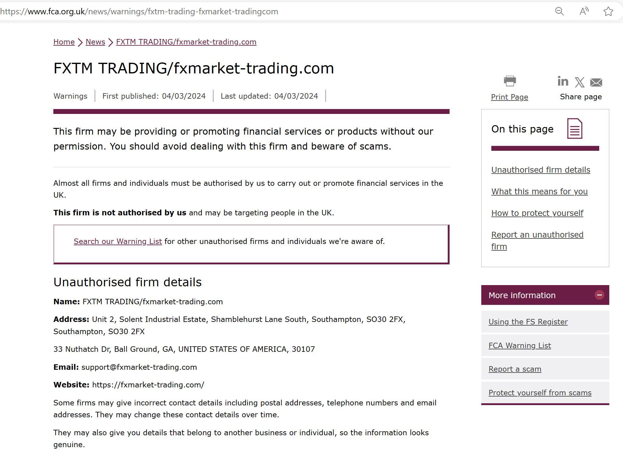First published: 04/03/2024 Last updated: 04/03/2024 This firm may be providing or promoting financial services or products without our permission. You should avoid dealing with this firm and beware of scams. Almost all firms and individuals must be authorised by us to carry out or promote financial services in the UK. This firm is not authorised by us and may be targeting people in the UK. Search our Warning List for other unauthorised firms and individuals we're aware of. Unauthorised firm details Name: FXTM TRADING/fxmarket-trading.com Address: Unit 2, Solent Industrial Estate, Shamblehurst Lane South, Southampton, SO30 2FX, Southampton, SO30 2FX 33 Nuthatch Dr, Ball Ground, GA, UNITED STATES OF AMERICA, 30107 Email: support@fxmarket-trading.com Website: https://fxmarket-trading.com/ Some firms may give incorrect contact details including postal addresses, telephone numbers and email addresses. They may change these contact details over time. They may also give you details that belong to another business or individual, so the information looks genuine.