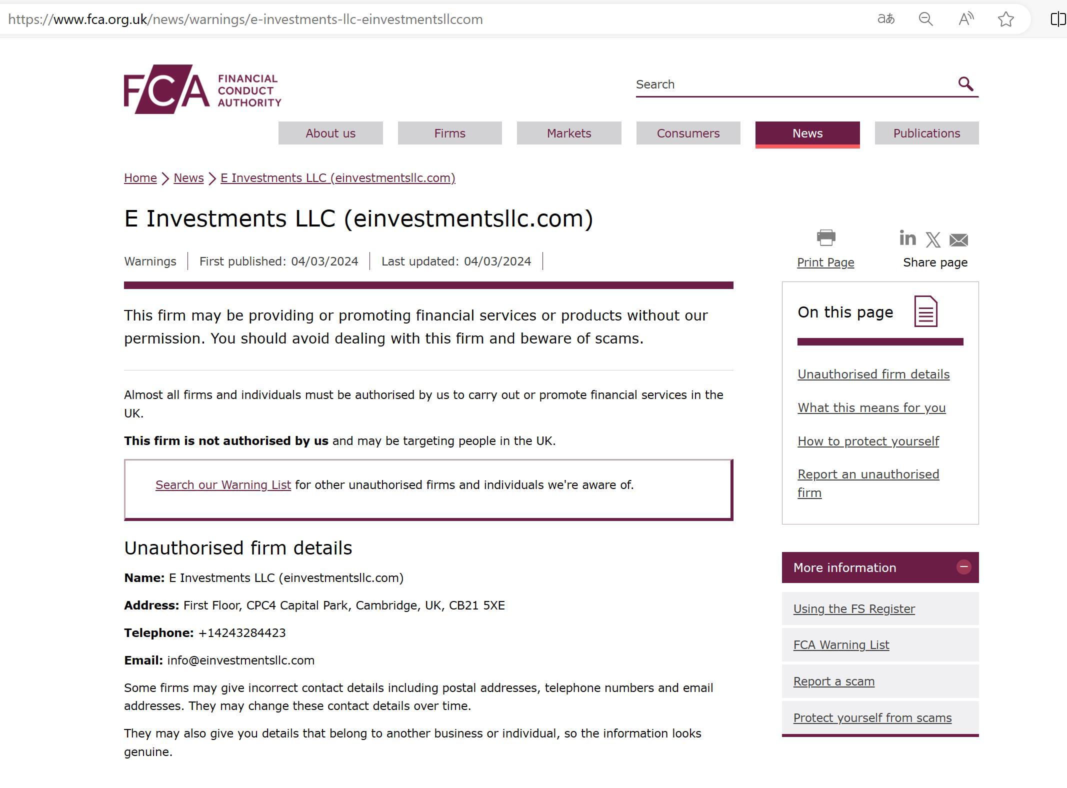 First published: 04/03/2024 Last updated: 04/03/2024 This firm may be providing or promoting financial services or products without our permission. You should avoid dealing with this firm and beware of scams. Almost all firms and individuals must be authorised by us to carry out or promote financial services in the UK. This firm is not authorised by us and may be targeting people in the UK. Search our Warning List for other unauthorised firms and individuals we're aware of. Unauthorised firm details Name: E Investments LLC (einvestmentsllc.com) Address: First Floor, CPC4 Capital Park, Cambridge, UK, CB21 5XE Telephone: +14243284423 Email: info@einvestmentsllc.com Some firms may give incorrect contact details including postal addresses, telephone numbers and email addresses. They may change these contact details over time. They may also give you details that belong to another business or individual, so the information looks genuine.