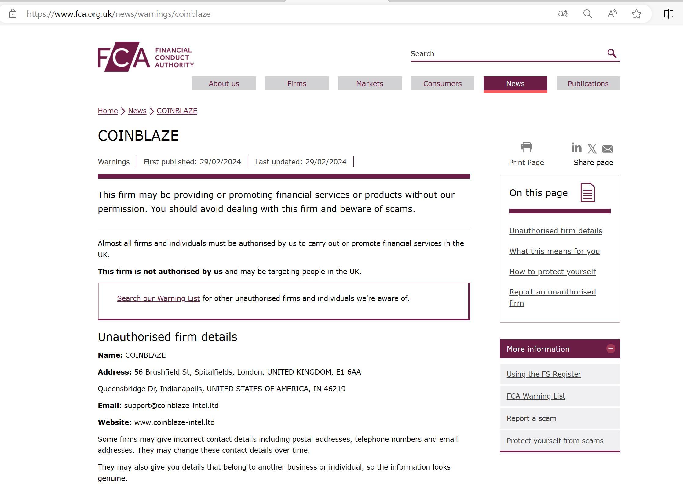 First published: 29/02/2024 Last updated: 29/02/2024 This firm may be providing or promoting financial services or products without our permission. You should avoid dealing with this firm and beware of scams. Almost all firms and individuals must be authorised by us to carry out or promote financial services in the UK. This firm is not authorised by us and may be targeting people in the UK. Search our Warning List for other unauthorised firms and individuals we're aware of. Unauthorised firm details Name: COINBLAZE Address: 56 Brushfield St, Spitalfields, London, UNITED KINGDOM, E1 6AA Queensbridge Dr, Indianapolis, UNITED STATES OF AMERICA, IN 46219 Email: support@coinblaze-intel.ltd Website: www.coinblaze-intel.ltd Some firms may give incorrect contact details including postal addresses, telephone numbers and email addresses. They may change these contact details over time. They may also give you details that belong to another business or individual, so the information looks genuine.