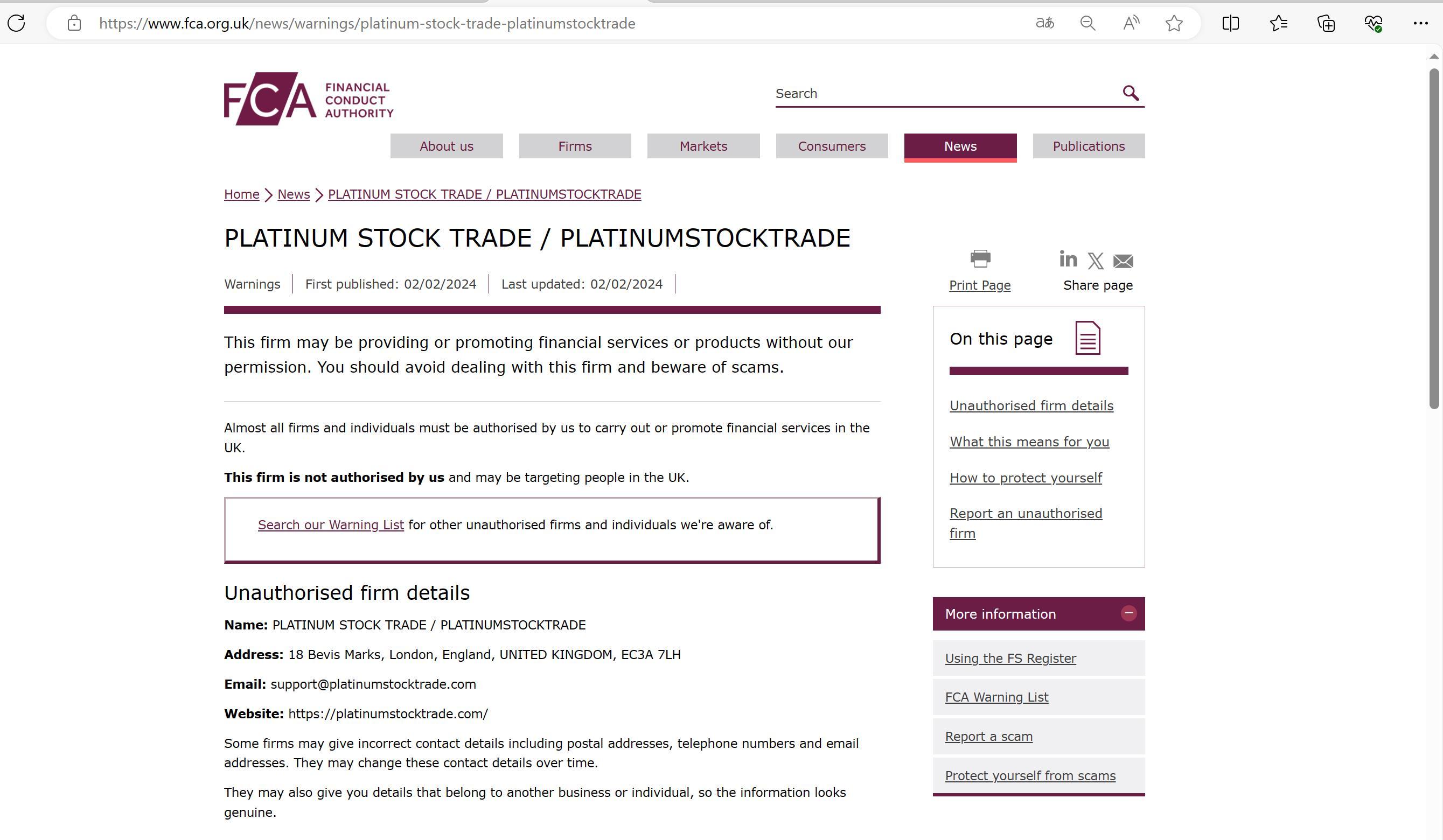 FCA Warning List of unauthorised firms PLATINUM STOCK TRADE / PLATINUMSTOCKTRADE