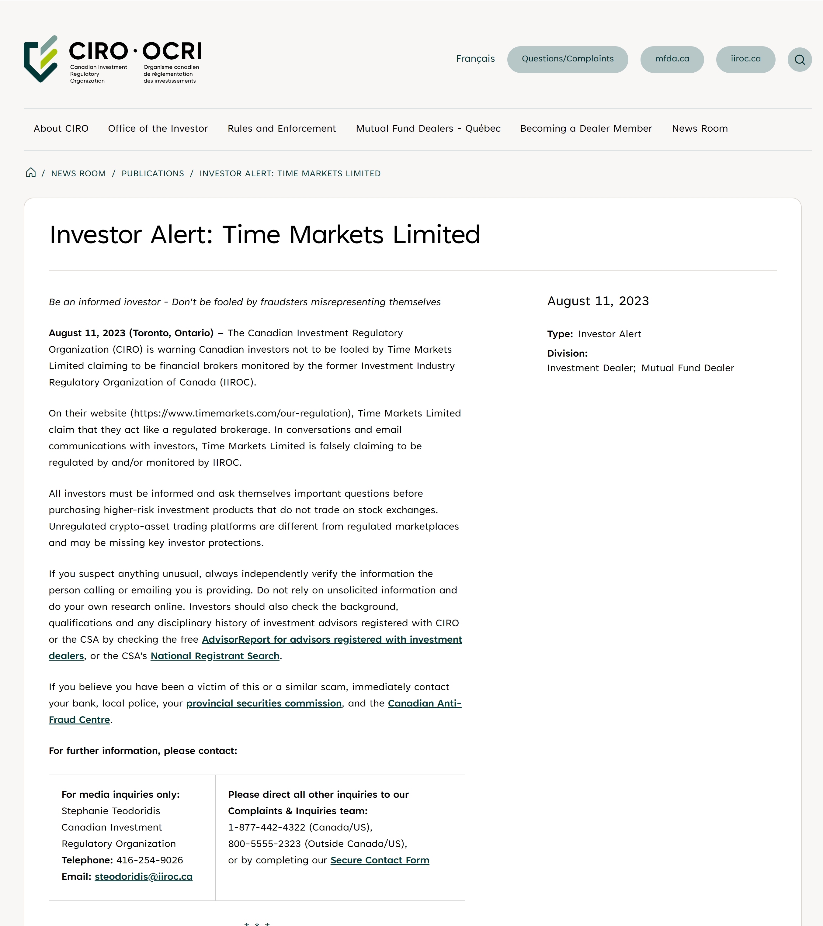 August 11, 2023 (Toronto, Ontario) – The Canadian Investment Regulatory Organization (CIRO) is warning Canadian investors not to be fooled by Time Markets Limited claiming to be financial brokers monitored by the former Investment Industry Regulatory Organization of Canada (IIROC).