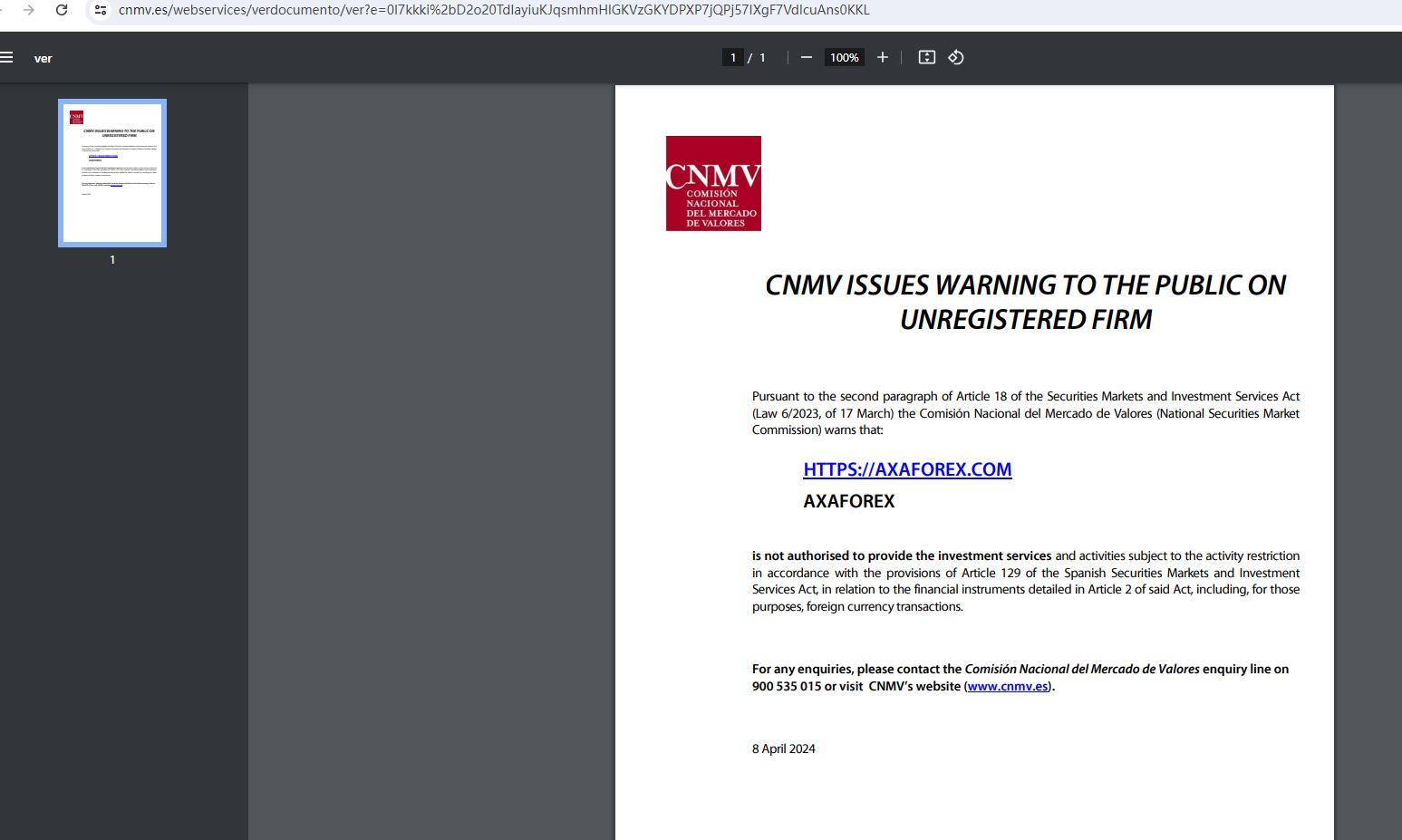 CNMV ISSUES WARNING TO THE PUBLIC ON UNREGISTERED FIRM Pursuant to the second paragraph of Article 18 of the Securities Markets and Investment Services Act (Law 6/2023, of 17 March) the Comisión Nacional del Mercado de Valores (National Securities Market Commission) warns that: HTTPS://AXAFOREX.COM AXAFOREX is not authorised to provide the investment services and activities subject to the activity restriction in accordance with the provisions of Article 129 of the Spanish Securities Markets and Investment Services Act, in relation to the financial instruments detailed in Article 2 of said Act, including, for those purposes, foreign currency transactions. For any enquiries, please contact the Comisión Nacional del Mercado de Valores enquiry line on 900 535 015 or visit CNMV’s website (www.cnmv.es). 8 April 2024