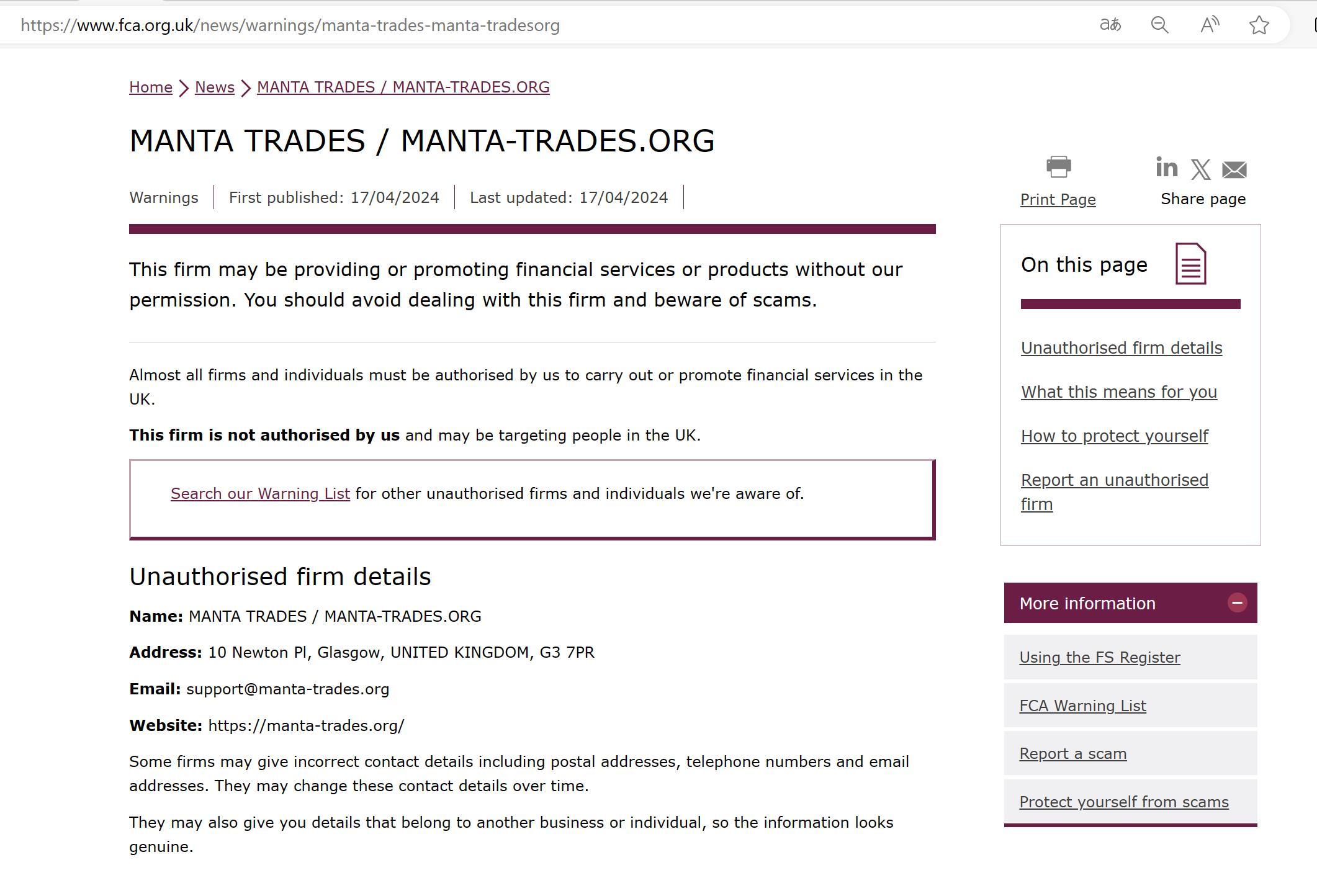 First published: 17/04/2024 Last updated: 17/04/2024 This firm may be providing or promoting financial services or products without our permission. You should avoid dealing with this firm and beware of scams. Almost all firms and individuals must be authorised by us to carry out or promote financial services in the UK. This firm is not authorised by us and may be targeting people in the UK. Search our Warning List for other unauthorised firms and individuals we're aware of. Unauthorised firm details Name: MANTA TRADES / MANTA-TRADES.ORG Address: 10 Newton Pl, Glasgow, UNITED KINGDOM, G3 7PR Email: support@manta-trades.org Website: https://manta-trades.org/ Some firms may give incorrect contact details including postal addresses, telephone numbers and email addresses. They may change these contact details over time. They may also give you details that belong to another business or individual, so the information looks genuine.