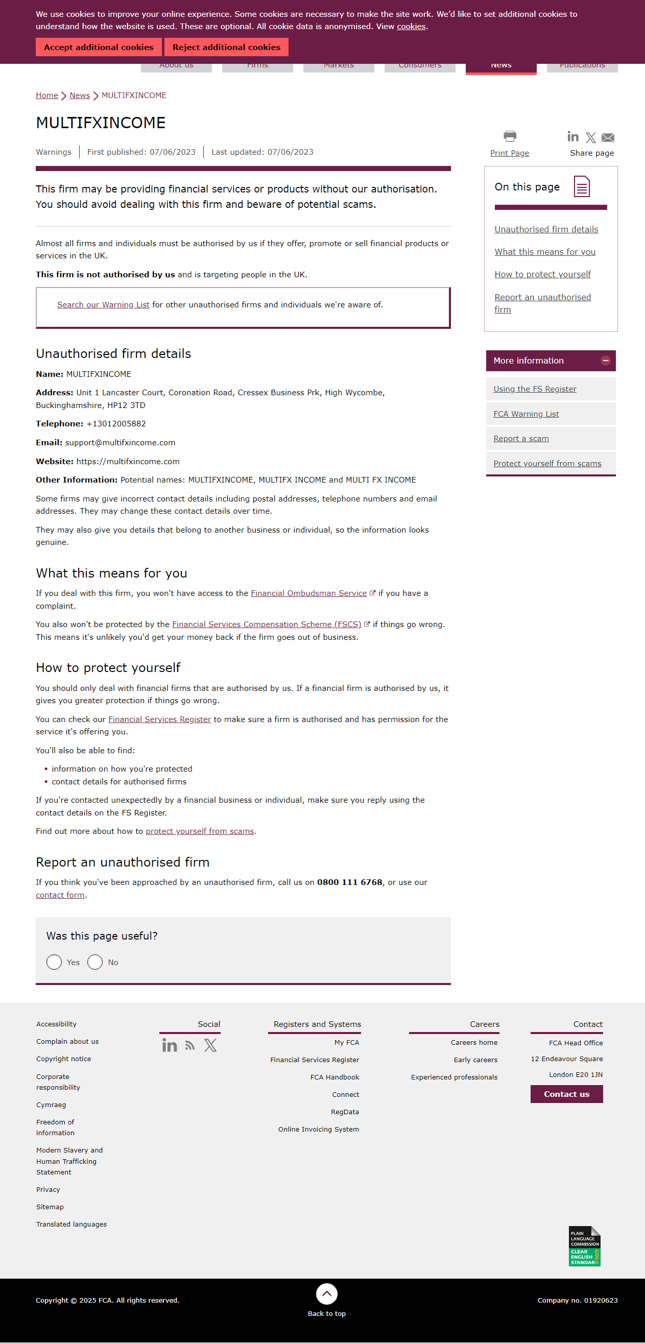 ['This firm may be providing financial services or products without our authorisation. You should avoid dealing with this firm and beware of potential scams. Almost all firms and individuals must be authorised by us if they offer, promote or sell financial products or services in the UK. This firm is not authorised by us and is targeting people in the UK. Search our Warning List for other unauthorised firms and individuals we're aware of. Unauthorised firm details Name: MULTIFXINCOME Address: Unit 1 Lancaster Court, Coronation Road, Cressex Business Prk, High Wycombe, Buckinghamshire, HP12 3TD Telephone: +13012005882 Email: support@multifxincome.com Website: https://multifxincome.com Other Information: Potential names: MULTIFXINCOME, MULTIFX INCOME and MULTI FX INCOME Some firms may give incorrect contact details including postal addresses, telephone numbers and email addresses. They may change these contact details over time. They may also give you details that belong to another business or individual, so the information looks genuine. "]