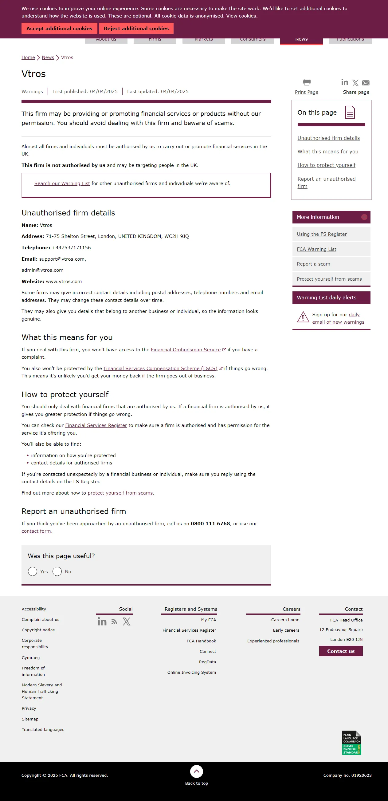 FCA Warning List of unauthorised firms Vtros