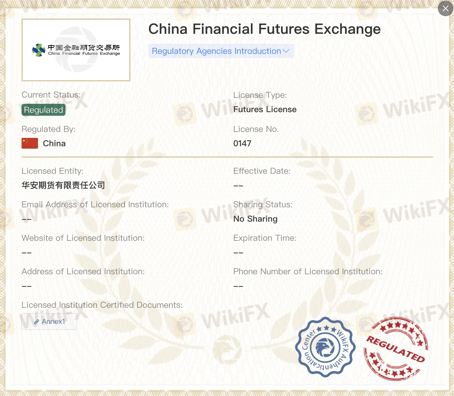 Sí, HUAAN FUTURES está regulado. Opera bajo la empresa con licencia 华安期货有限责任公司, que está regulada por la Bolsa de Futuros Financieros de China (CFFEX) en China. El organismo regulador ha otorgado una Licencia de Futuros con el número 0147. El estado regulatorio actual de la licencia es "Regulado".