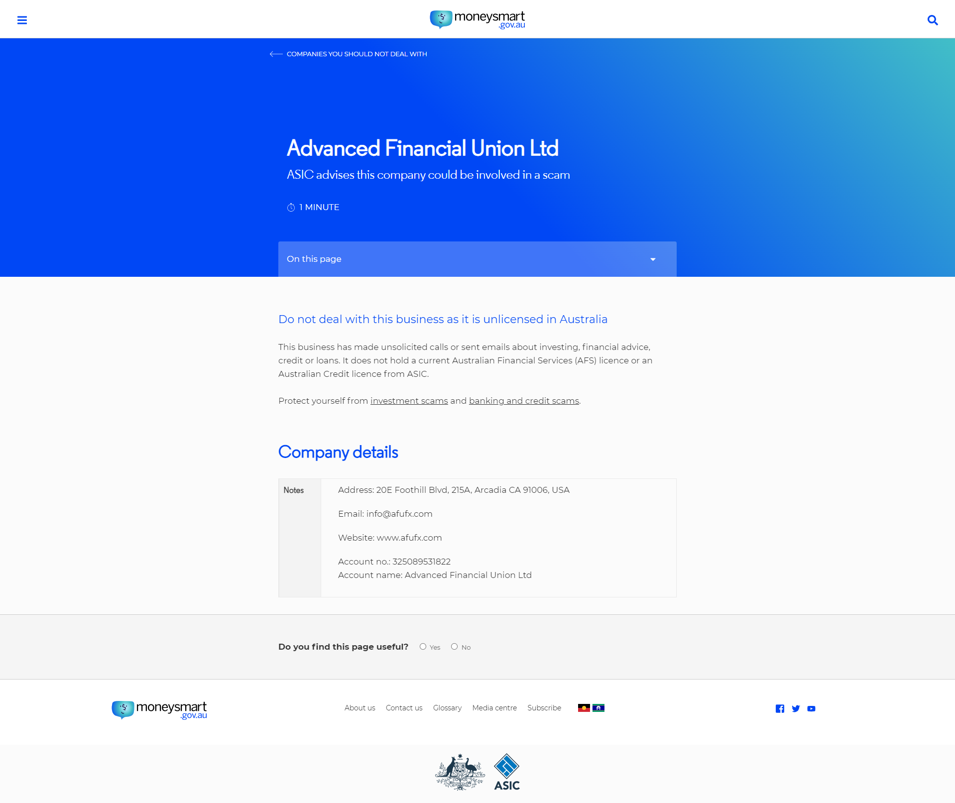 lista de alerta de inversores Advanced Financial Union Ltd ASIC advierte que esta empresa podría estar involucrada en una estafa.