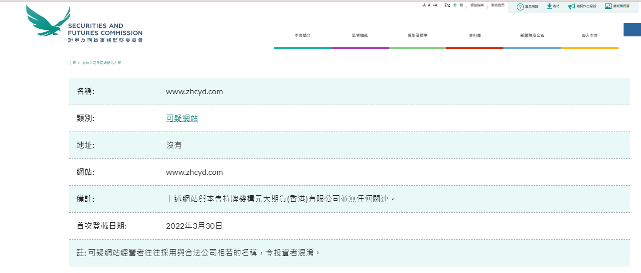 Nombre: www.zhcyd.com Categoría: Sitio web sospechoso Dirección: No Sitio web: www.zhcyd.com Observaciones: El sitio web anterior no tiene conexión con Yuanta Futures (Hong Kong) Co., Ltd., la institución autorizada de la Asociación. Fecha de la primera publicación: 30 de marzo de 2022 Nota: Los operadores de sitios web sospechosos suelen utilizar nombres similares a empresas legítimas, lo que confunde a los inversores. La lista de empresas sin licencia y sitios web sospechosos enumera empresas que no tienen licencia en Hong Kong y que han atraído la atención de la SFC. Se sospecha que estas empresas están o estaban comercializando para inversores de Hong Kong, o que afirman tener vínculos con Hong Kong. Puede buscar por nombre o categoría para ver si una empresa está en la lista. Esta lista no es exhaustiva. Como la SFC a menudo encuentra empresas o sitios web destacados, se agregan nuevos a la lista de vez en cuando. Si ha estado contactado por una empresa sin licencia, utilice nuestro formulario de quejas en línea. Para obtener más información sobre salas de calderas, sitios web fraudulentos y correos electrónicos de phishing, haga clic en los enlaces correspondientes. NOTA: La lista de empresas sin licencia y sitios web sospechosos está destinada a emitir una alerta temprana a los inversores. Los inversores no pueden confiar únicamente en la información de la lista anterior, deben verificar cuidadosamente los detalles de las empresas individuales. Seleccione la primera letra en inglés del nombre de cada columna para ver la lista, o haga clic en "Nombre chino". columna busca empresas con nombres chinos solamente".