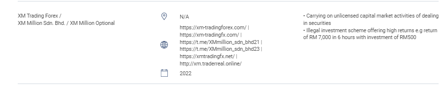 "Esta sección contiene la lista de sitios web no autorizados, productos de inversión, empresas e individuos. Esta lista incluye: personas que realizan o se hacen pasar por realizar las siguientes actividades reguladas sin una licencia de la sc: negociación de valores; negociación de derivados; gestión de fondos, asesoramiento sobre finanzas corporativas, asesoramiento de inversión, planificación financiera y transacciones en planes de jubilación privados, personas que operan un mercado reconocido sin autorización, personas que emiten u ofrecen valores sin aprobación, autorización o reconocimiento, personas que usan indebidamente el logotipo de sc y tergiversan el sc. " xm comercio de divisas / xm millones sdn. bhd / xm millones opcional n/a https://xm-tradingforex.com/ | https://xm-tradingfx.com/ | https://t.me/xmmillion_sdn_bhd21 | https://t.me/xmmillion_sdn_bhd23 | https:// Xmtradingfx.net / | http://xm.traderreal.online/ 2022 • llevar a cabo actividades de mercado de capitales sin licencia de negociación de valores • esquema de inversión ilegal que ofrece altos rendimientos, por ejemplo, retorno de rm 7,000 en 6 horas con una inversión de rm500