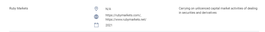 "Esta sección contiene la lista de sitios web no autorizados, productos de inversión, empresas e individuos. Esta lista incluye: personas que realizan o se hacen pasar por realizar las siguientes actividades reguladas sin una licencia de la sc: negociación de valores; negociación de derivados; gestión de fondos, asesoramiento sobre finanzas corporativas, asesoramiento de inversión, planificación financiera y transacciones en planes de jubilación privados, personas que operan un mercado reconocido sin autorización, personas que emiten u ofrecen valores sin aprobación, autorización o reconocimiento, personas que usan indebidamente el logotipo de sc y tergiversan el sc. " mercados ruby n/a https:// RubyMarkets .com/, https://www. RubyMarkets .net/ 2021 llevar a cabo actividades de mercado de capitales sin licencia de negociación de valores y derivados