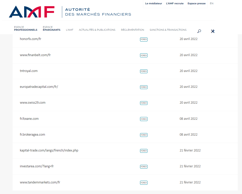 Esta es una lista de empresas o sitios web incluidos en la lista negra de la Autorité des Marchés Financiers (AMF), advertencias y/o usurpaciones de empresas reguladas.