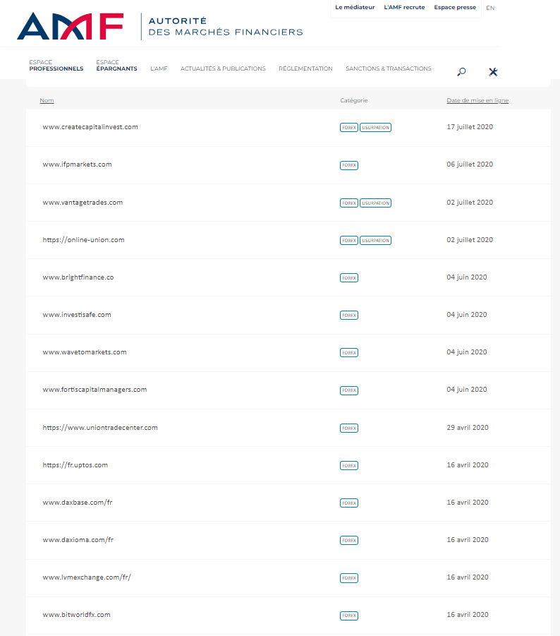 Esta es una lista de empresas o sitios web incluidos en la lista negra de la Autorité des Marchés Financiers (AMF), advertencias y/o usurpaciones de empresas reguladas.