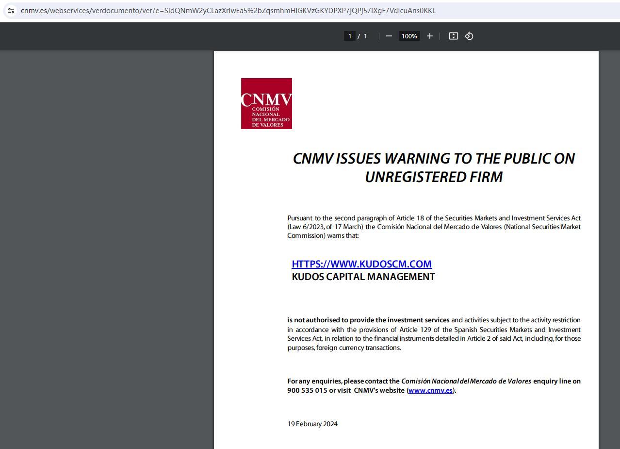 CNMV emite advertencia al público sobre empresa no registrada de conformidad con el párrafo segundo del artículo 18 de la Ley del Mercado de Valores y Servicios de Inversión (Ley 6/2023, de 17 de marzo) La Comisión Nacional del Mercado de Valores advierte que : https://www.kudoscm.com Kudos Capital Management no está autorizado a prestar los servicios y actividades de inversión sujetos a la restricción de actividad de acuerdo con lo dispuesto en el artículo 129 de la Ley de los Mercados de Valores y de Servicios de Inversión, en relación con los instrumentos financieros detallados en el artículo 2 de dicha ley, incluyendo, por a esos efectos, las transacciones en moneda extranjera. Para cualquier consulta puede ponerse en contacto con el teléfono de consultas de la Comisión Nacional del Mercado de Valores en el teléfono 900 535 015 o visitar la página web de la CNMV (www.cnmv.es). 19 de febrero de 2024