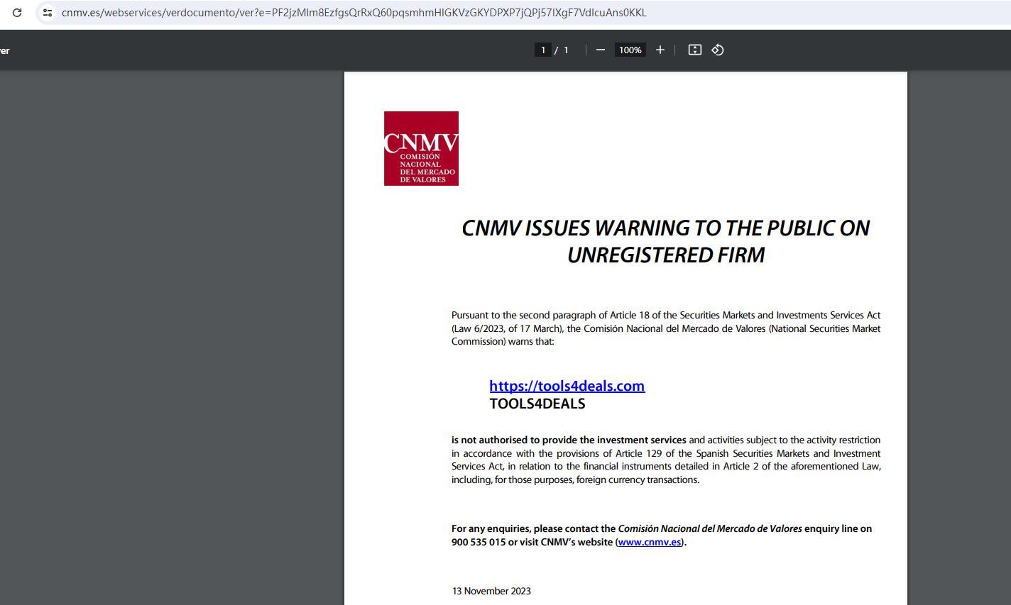 La CNMV LANZA ADVERTENCIAS AL PÚBLICO SOBRE LAS EMPRESAS NO REGISTRADAS De conformidad con el artículo 18, párrafo segundo, de la Ley de los Mercados de Valores y de Servicios de Inversiones (Ley 6/2023, de 17 de marzo), la Comisión Nacional del Mercado de Valores advierte que: https://tools4deals.com TOOLS4DEALS no está autorizada a prestar los servicios y actividades de inversión sujetos a la restricción de actividad de acuerdo con lo dispuesto en el artículo 129 de la Ley del Mercado de Valores y de Servicios de Inversión, en relación con los instrumentos financieros detallados en el artículo 2 de la citada Ley, incluidas, a estos efectos, las transacciones en moneda extranjera. Para cualquier consulta puede dirigirse al teléfono de atención de la Comisión Nacional del Mercado de Valores en el teléfono 900 535 015 o visitar la página web de la CNMV (www.cnmv.es). 13 de noviembre de 2023