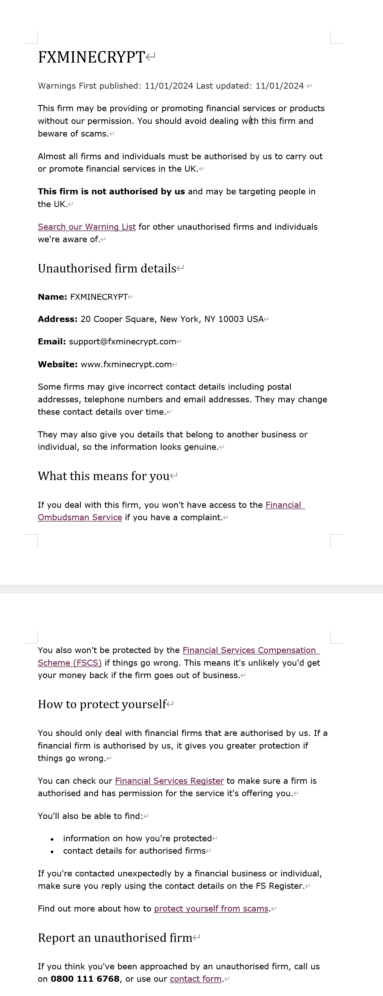 FXMINECRYPTadvertencias publicadas por primera vez: 01/11/2024 última actualización: 01/11/2024 esta empresa puede estar proporcionando o promocionando servicios o productos financieros sin nuestro permiso. Debe evitar tratar con esta empresa y tener cuidado con las estafas. Casi todas las empresas e individuos deben estar autorizados por nosotros para realizar o promover servicios financieros en el Reino Unido. Esta empresa no está autorizada por nosotros y puede estar dirigida a personas en el Reino Unido. Busque en nuestra lista de advertencias otras empresas e individuos no autorizados que conozcamos. nombre de detalles de la empresa no autorizada: FXMINECRYPT dirección: 20 cooper square, nueva york, ny 10003 estados unidos correo electrónico: support@ FXMINECRYPT Sitio web .com: www. FXMINECRYPT .com algunas empresas pueden proporcionar datos de contacto incorrectos, incluidas direcciones postales, números de teléfono y direcciones de correo electrónico. pueden cambiar estos datos de contacto con el tiempo. También pueden brindarle detalles que pertenecen a otra empresa o individuo, para que la información parezca genuina. Lo que esto significa para usted si trabaja con esta empresa, no tendrá acceso al servicio del defensor del pueblo financiero si tiene una queja. Tampoco estará protegido por el sistema de compensación de servicios financieros (fscs) si algo sale mal. esto significa que es poco probable que le devuelvan su dinero si la empresa cierra. cómo protegerse sólo debe tratar con empresas financieras que estén autorizadas por nosotros. Si autorizamos una empresa financiera, le brinda mayor protección si algo sale mal. Puede consultar nuestro registro de servicios financieros para asegurarse de que una empresa esté autorizada y tenga permiso para el servicio que le ofrece. También podrá encontrar: • información sobre cómo está protegido • detalles de contacto de empresas autorizadas si una empresa financiera o un individuo se comunica con usted inesperadamente, asegúrese de responder utilizando los detalles de contacto en el registro fs. Obtenga más información sobre cómo protegerse de las estafas. informe sobre una empresa no autorizada si cree que una empresa no autorizada se ha acercado a usted, llámenos al 0800 111 6768 o utilice nuestro formulario de contacto.