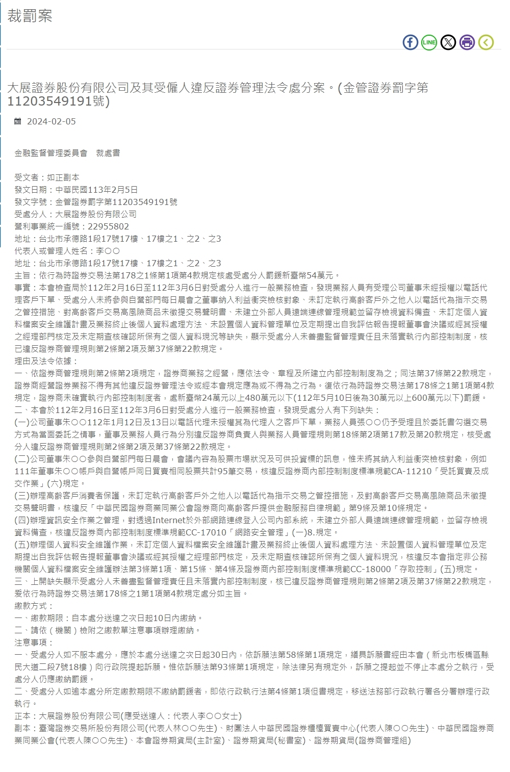 Destinatario de la medida disciplinaria de la Comisión de Supervisión Financiera: Copia original Fecha de emisión: 5 de febrero de 2013 Número de emisión: Gestión Financiera de Valores Sanción No. 11203549191 Destinatario de la sanción: 大展證券股份有限公司 Número unificado de empresa con fines de lucro: 22955802 Dirección: Piso 17, Piso 17, Piso 2, Piso 3, No. 17, Sección 1, Chengde Road, Ciudad de Taipei Nombre del representante o gerente: Li ○○ Dirección: No. 17, Sección 1, Chengde Road, Ciudad de Taipei Piso, Piso 17-1, Piso 2 y Piso 3. Objeto: De conformidad con las disposiciones del Artículo 178-1, Párrafo 1, Párrafo 4 de la Ley de Bolsa y Valores en el momento de la acto, la persona sancionada será multada con NT$ 540.000. Hechos: La Oficina de Inspección de la Cámara de Comercio realizó una inspección comercial general a la persona sujeta a sanción del 16 de febrero de 2020 al 6 de marzo de 2020. Se encontró que el personal comercial aceptó el uso no autorizado del teléfono por parte del director de la empresa para colocar órdenes en nombre de los clientes, y la persona sujeta a sanción no lo hizo. Los directores que participan en las reuniones matutinas diarias del departamento autónomo están incluidos en la revisión de conflicto de intereses, no existen medidas de control para la ejecución de transacciones instruidas por otros que no sean clientes senior por teléfono, y no se requiere declaración de transacción para que los clientes senior intercambien productos de alto riesgo. No establecer estándares de gestión de conexión remota para personal externo y conservar datos de inspección como referencia, no formular un plan de mantenimiento de seguridad de archivos de datos personales y Métodos de procesamiento de datos personales después de la terminación del negocio, no creación de una unidad de gestión de datos personales y no presentación periódica de informes de autoevaluación al consejo de administración. Defectos como la resolución o la aprobación del departamento de gestión autorizado por este y la falta de control periódico. y confirmar el estado actual de los datos personales conservados demuestran que la persona sancionada no ha cumplido con sus responsabilidades de supervisión y gestión y no ha implementado el sistema de control interno, y ha violado el artículo 1 del Reglamento de Gestión de Agentes de Valores, el artículo 2, párrafo 2, y Artículo 37, párrafo 22. Motivos y fundamento jurídico: 1. Según el artículo 2, párrafo 2 del Reglamento de gestión de agentes de valores, las actividades de una empresa de valores se llevarán a cabo de conformidad con la ley, los estatutos y el sistema de control interno establecido, artículo 37, párrafo 22 de la misma ley, establece que las Casas de Valores que operen negocios de valores no deberán incurrir en ninguna otra conducta que viole las leyes o reglamentos de administración de valores que sean requeridos o prohibidos por la Comisión. De conformidad con lo dispuesto en el artículo 178-1, párrafo 1, párrafo 4 de la Ley de Bolsa y Valores en el momento de la ley, una empresa de valores que no implemente el sistema de control interno será multada con no menos de NT $ 240.000 pero no más de NT$4,8 millones (30 después del 10 de mayo de 2020). Una multa de no menos de 10.000 yuanes pero no más de 6 millones de yuanes). 2. La Asociación realizó una inspección comercial general a la persona sancionada del 16 de febrero de 2012 al 6 de marzo de 2012 y encontró que la persona sancionada tenía las siguientes deficiencias: (1) Director Zhu ○○ de la empresa el 12 de enero de 2012 y El día 13, un cliente que no lo autorizaba a actuar como agente realizó un pedido por teléfono. El vendedor Zhang ○○ aun así aceptó el pedido y seleccionó el método de transacción como encomienda cara a cara en el poder. La conducta del director y del vendedor violó las normas del responsable de la empresa de valores y del vendedor, respectivamente. Los artículos 18, párrafo 2, párrafo 17 y párrafo 20 del Reglamento de Gestión del Personal de Negocios estipulan que la persona sujeta a El castigo violó las disposiciones del artículo 2, párrafo 2 y del artículo 37, párrafo 22 del Reglamento de gestión de agentes de valores. (2) El director Zhu ○○ de la empresa participó en la reunión matutina diaria del departamento autónomo. El contenido de la reunión fue las condiciones del mercado de valores y la información sobre los objetivos de inversión disponibles, pero no se incluyó en la revisión del conflicto de intereses. Por ejemplo, la cuenta del director Zhu ○○ en 2011 y un total de 95 transacciones de las mismas acciones se compraron y vendieron en la cuenta autooperada el mismo día, lo que violó las disposiciones de CA-11210 "Comercio encomendado y Operaciones Transaccionales" (6) de la Especificación Normativa del Sistema de Control Interno de las Sociedades de Valores. (3) Manejar la protección del consumidor de los clientes de edad avanzada, no formular medidas de control para la ejecución de transacciones instruidas por otras personas que no sean clientes de edad avanzada por teléfono y no recopilar declaraciones de transacciones para clientes de edad avanzada que comercian con productos básicos de alto riesgo, violando el " Comercio de Valores de la República de China", artículos 9 y 10 del "Código de autorregulación de los servicios financieros prestados a clientes de edad avanzada por agentes de valores de la Asociación Comercial". (4) Gestión de las operaciones de seguridad de la información, no establecer estándares de gestión de conexiones remotas para que el personal externo inicie sesión en los sistemas internos de la empresa a través de Internet y retenga datos de inspección para referencia futura, para detectar violaciones de los estándares del sistema de control interno de las firmas de v