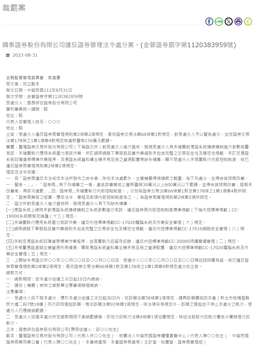 Notificación disciplinaria de la Comisión de Supervisión Financiera: Destinatario: Copia original Fecha de emisión: 31 de agosto de 2012 Número de emisión: Gestión Financiera de Valores No. 1120383959 Destinatario: Cathay Securities Número unificado de empresas con fines de lucro de una sociedad anónima: dirección abreviada: nombre abreviado del representante o gerente: 〇〇〇 dirección: abreviada Objeto: La persona sancionada violó lo dispuesto en el artículo 2, inciso 2 del Reglamento de Gestión de Agentes de Valores , de conformidad con el artículo 66 de la Ley de Bolsa y Valores, el párrafo 1 del artículo estipula que la persona sancionada recibirá una amonestación y se impondrá una multa de NT $ 1,5 millones de conformidad con el artículo 178-1, párrafo 1, Párrafo 4 de la Ley de Bolsa y Valores. Hechos: La Bolsa de Valores de Taiwán Co., Ltd. (en lo sucesivo, la Bolsa de Valores) realizó una inspección a la persona sujeta al castigo y descubrió que la persona sujeta al castigo en realidad no había realizado pruebas de capacidad de parámetros del mecanismo de conexión del sistema de certificados. , no pudo realizar realmente las pruebas de estrés del sistema de aplicaciones, los detalles de operación de calidad del servicio de pedidos de Internet no incluyen especificaciones completas de seguridad y estabilidad de las transacciones, no se establecieron procedimientos operativos estándar para la recuperación de fallas del sistema de certificados y el host de la base de datos del sistema de certificados no tiene suficiente asignación de recursos, etc. Demuestra que la persona sancionada no implementó el sistema de control interno y violó el Artículo 2, Inciso 2 del Reglamento de Gestión de Agentes de Valores. Razones y fundamento jurídico: 1. Según "Si una casa de bolsa viola esta Ley o las órdenes dictadas conforme a esta Ley, además de ser sancionada conforme a esta Ley, la autoridad competente podrá, dependiendo de la gravedad del caso, imponerle las siguientes sanciones, pudiendo ordenarle mejoras en un plazo determinado: 1. Advertencia...", "Si una casa de bolsa... incurre en alguna de las siguientes circunstancias, la empresa o asociación será multada con una multa no inferior a NT 300.000 dólares, pero no más de 6 millones de dólares NT, y se le puede ordenar que realice mejoras dentro de un plazo; si no realiza mejoras dentro del plazo, se le puede castigar caso por caso: ... 4. El empresa de valores... no implementó el sistema de control interno." Así se estipula en el artículo 66, párrafo 1, y en el artículo 178-1, párrafo 1, párrafo 4 de la Ley del Mercado de Valores, respectivamente; "La actividad de una empresa de valores Las operaciones se realizarán de conformidad con las leyes, los estatutos sociales y el sistema de control interno señalado en el párrafo anterior." Así se establece en el artículo 2, inciso 2 del Reglamento de Gestión de las Sociedades de Valores. 2. Cuando la bolsa de valores inspeccionó a la persona sujeta al castigo, encontró que la persona sujeta al castigo tenía las siguientes deficiencias: (1) Los parámetros del sistema del mecanismo de conexión del sistema de certificados no se probaron cuando se lanzó el sistema de certificados, lo que violó las normas y especificaciones del sistema de control interno de las casas de bolsa (en adelante Normas y Especificaciones de Control Interno) CC-19000 Reglamento de Desarrollo y Mantenimiento de Sistemas (13). (2) No realizar efectivamente las operaciones de pruebas de estrés del sistema de aplicación, violando las normas de control interno CC-17020 Sistemas de Computación y Gestión de Seguridad de Operación (6). (3) Las reglas operativas de calidad del servicio de pedidos de Internet no incluyen especificaciones completas de seguridad y estabilidad de las transacciones, lo que viola los estándares de control interno CC-17010 Network Security Management (8). (4) No formular procedimientos operativos estándar para la recuperación de fallas del sistema de comprobantes, implementarlos y llevar registros, violando la norma de control interno CC-20000 Gestión de Operación Continua (2). (5) No considerar la situación de intercambio de recursos del host virtual del certificado, lo que resulta en una asignación de recursos insuficiente para el host de la base de datos del sistema de certificado, violando los estándares de control interno CC-17020 Sistema informático y gestión de seguridad operativa (5). 3. Las deficiencias en la apertura anterior se acreditan mediante cartas de la Bolsa de valores de 000 de enero de 2000 y de 000 de enero de 2000, y declaraciones del sancionado de 000 de enero de 2000 y 00 de octubre de 2000, y han sido verificadas. La infracción del párrafo 2 del artículo 2 del Reglamento de gestión de agentes de valores será sancionada de conformidad con el párrafo 1 del artículo 66 y el párrafo 4 del párrafo 1 del artículo 178-1 de la Ley del Mercado de Valores. Forma de pago: 1. Plazo de pago: Paga dentro de los 10 días siguientes al día siguiente del cumplimiento de esta sanción. 2. Realice el pago de acuerdo con las precauciones que figuran en el comprobante de pago adjunto a la (agencia). Notas: 1. Si la persona sancionada no está satisfecha con este castigo, deberá presentar una petición a través de esta Asociación (Distrito de Banqiao, Nueva Ciudad de Taipei) de conformidad con las disposiciones del Artículo 58, Párrafo 1 de la Ley de Peticiones dentro de los 30 días. desde el día siguiente al cumplimiento del castigo (piso 18, n.º 7, sección 2, avenida Xianmin) presentó una petición ante el Yuan Ejecutivo. Sin embargo, según el párrafo 1 del artículo 93 de la Ley de Peticiones, a menos que la ley disponga lo contrario, la presentación de un recurso no detiene la ejecución de esta sanción, y la persona sancionada seguirá pagando la multa. 2. Si la persona sancionada no paga
