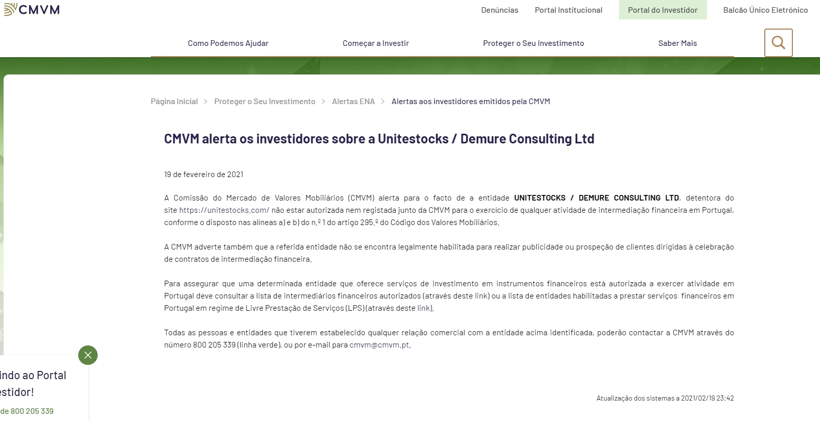 19 de febrero de 2021, la comisión del mercado de valores (cmvm) alerta que la entidad Unitestocks / Demure Consulting LTD , propietario del sitio web https:// Unitestocks .com/ no está autorizado ni registrado en la cmvm para realizar ninguna actividad de intermediación financiera en Portugal, de conformidad con lo dispuesto en los incisos a) y b) del número 1 del artículo 295 del código de valores. La cmvm también advierte que la mencionada entidad no está legalmente habilitada para realizar publicidad o prospección de clientes encaminada a celebrar contratos de intermediación financiera. Para asegurarse de que una determinada entidad que ofrece servicios de inversión en instrumentos financieros esté autorizada a realizar actividades en Portugal, debe consultar la lista de intermediarios financieros autorizados (a través de este enlace) o la lista de entidades autorizadas a prestar servicios financieros en Portugal bajo un Régimen gratuito de prestación de servicios (lps) (a través de este enlace). Todas las personas y entidades que hayan establecido alguna relación comercial con la entidad identificada anteriormente podrán contactar a cmvm a través del número 800 205 339 (línea verde), o por correo electrónico a cmvm@cmvm.pt. actualización de sistemas el 19/02/2021 23:42
