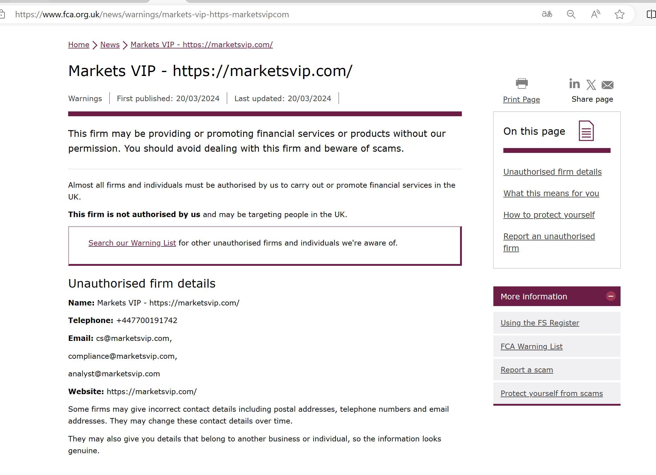Publicado por primera vez: 20/03/2024 Última actualización: 20/03/2024 Esta empresa puede estar proporcionando o promocionando servicios o productos financieros sin nuestro permiso. Debe evitar tratar con esta empresa y tener cuidado con las estafas. Casi todas las empresas e individuos deben estar autorizados por nosotros para realizar o promover servicios financieros en el Reino Unido. Esta empresa no está autorizada por nosotros y puede estar dirigida a personas en el Reino Unido. Busque en nuestra lista de advertencias otras empresas e individuos no autorizados que conozcamos. nombre de detalles de la empresa no autorizada: Markets VIP - https://marketsvip.com/ teléfono: +447700191742 correo electrónico: cs@marketsvip.com, cumplimiento@marketsvip.com, analista@marketsvip.com sitio web: https://marketsvip.com/ algunas empresas pueden proporcionar datos de contacto incorrectos, incluidos direcciones postales, números de teléfono y direcciones de correo electrónico. pueden cambiar estos datos de contacto con el tiempo. También pueden brindarle detalles que pertenecen a otra empresa o individuo, para que la información parezca genuina.