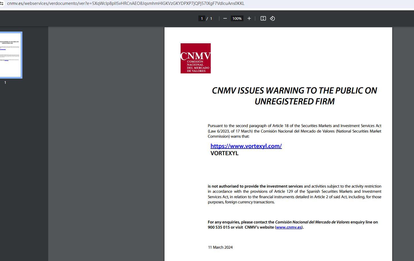 CNMV emite advertencia al público sobre empresa no registrada de conformidad con el párrafo segundo del artículo 18 de la Ley del Mercado de Valores y Servicios de Inversión (Ley 6/2023, de 17 de marzo) La Comisión Nacional del Mercado de Valores advierte que : https://www. Vortexyl .com/ Vortexyl no está autorizado a prestar los servicios y actividades de inversión sujetos a la restricción de actividad de acuerdo con lo dispuesto en el artículo 129 de la Ley de los Mercados de Valores y Servicios de Inversión, en relación con los instrumentos financieros detallados en el artículo 2 de dicha ley, incluyendo, por a esos efectos, las transacciones en moneda extranjera. Para cualquier consulta puede ponerse en contacto con el teléfono de consultas de la Comisión Nacional del Mercado de Valores en el teléfono 900 535 015 o visitar la página web de la CNMV (www.cnmv.es). 11 de marzo de 2024