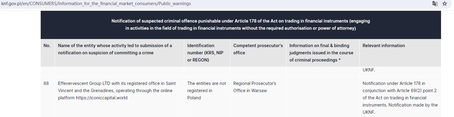Effevervescent Group LTD con domicilio social en San Vicente y las Granadinas, que opera a través de la plataforma en línea https://iconiccapital.world Las entidades no están registradas en la Fiscalía Regional de Polonia en Varsovia Notificación en virtud del artículo 178 en relación con el artículo 69(2) punto 2 de la Ley sobre el comercio de instrumentos financieros. Notificación realizada por la UKNF.