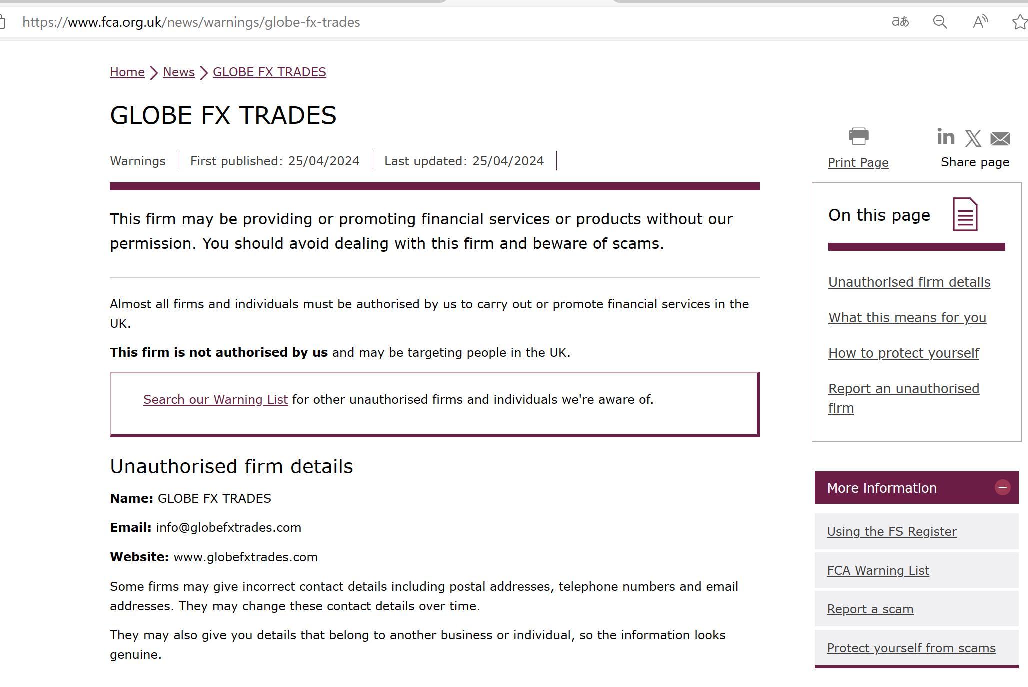 Lista de Advertencia de la FCA de empresas no autorizadas GLOBE FX TRADES.