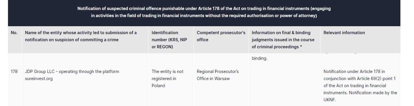 jdp group llc - operando a través de la plataforma SUREINVEST .org la entidad no está registrada en la fiscalía regional de polonia en varsovia notificación según el artículo 178 en relación con el artículo 69(2) punto 1 de la ley sobre el comercio de instrumentos financieros. notificación hecha por la uknf.