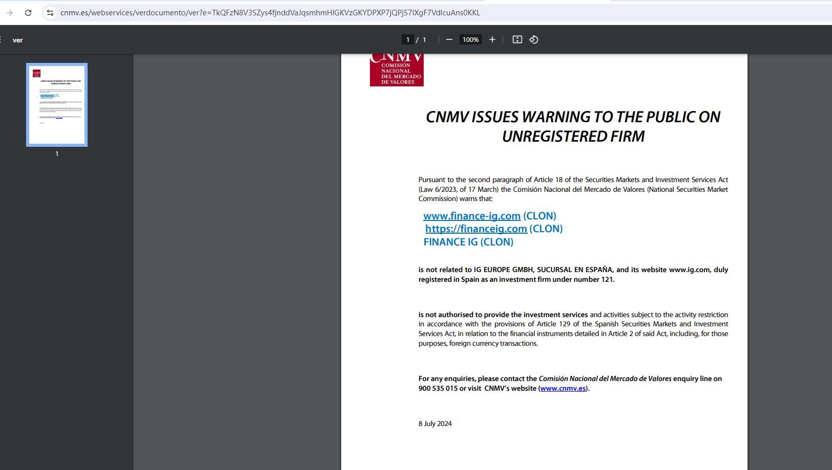 La Comisión Nacional del Mercado de Valores advierte al público sobre la no inscripción de una entidad en el Registro Mercantil de conformidad con el artículo 18, párrafo segundo, de la Ley 6/2023, de 17 de marzo, del Mercado de Valores. La Comisión Nacional del Mercado de Valores advierte de que: www.finance-ig.com (clon) https://financeig.com (clon) Finance IG (clon) no está relacionada con ig europe gmbh, sucursal en españa, y su página web www.ig.com, debidamente registrada en españa como empresa de servicios de inversión con el número 121. no está autorizada para la prestación de los servicios y actividades de inversión sujetos a la restricción de actividad de acuerdo con lo establecido en el artículo 129 de la ley del mercado de valores y de servicios de inversión, en relación con los instrumentos financieros detallados en el artículo 2 de dicha ley, incluidas, a estos efectos, las operaciones en moneda extranjera. para cualquier consulta, puede dirigirse a la línea de consultas de la comisión nacional del mercado de valores en el 900 535 015 o visitar la página web de la CNMV (www.cnmv.es). 8 de julio de 2024