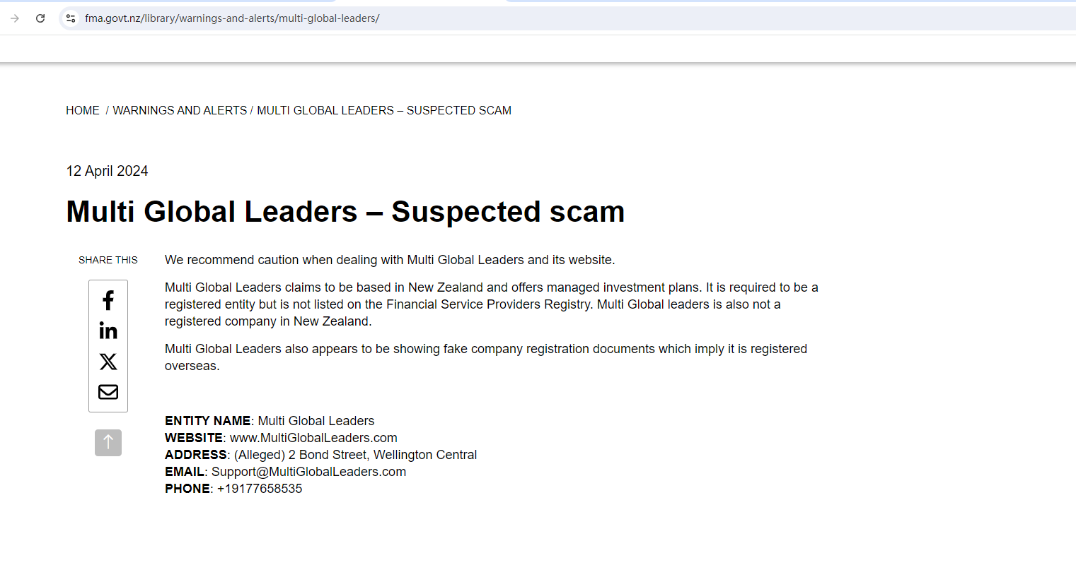 12 de abril de 2024 Multi global leaders – sospecha de estafa comparte esto recomendamos precaución al tratar con Multi global leaders y su sitio web. Multi global leaders Afirma tener su sede en Nueva Zelanda y ofrece planes de inversión gestionados. Se requiere que sea una entidad registrada, pero no figura en el registro de proveedores de servicios financieros. Multi global leaders Tampoco es una empresa registrada en Nueva Zelanda. Multi global leaders También parece estar mostrando documentos de registro de empresa falsos que implican que está registrada en el extranjero. Nombre de la entidad: Multi global leaders Sitio web: www.multigloballeaders.com Dirección: (presuntamente) 2 Bond Street, Wellington Central Correo electrónico: support@multigloballeaders.com Teléfono: +19177658535